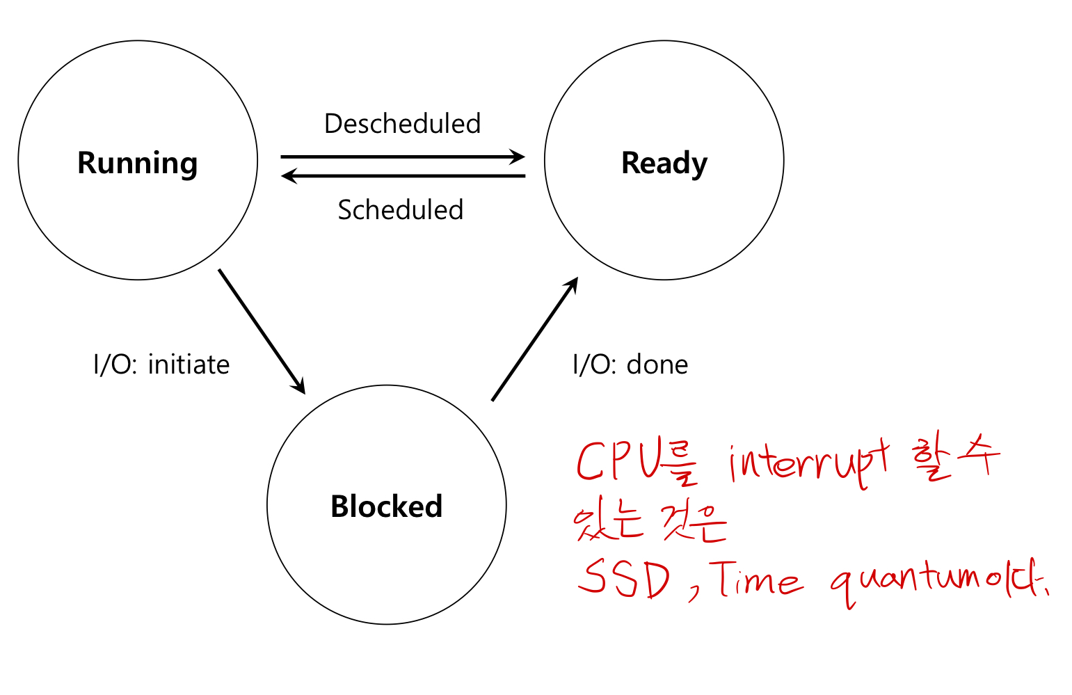 Point counter가 Instruction을 읽다가 I/O request를 만나게 되면 I/O는 시간이 오래 걸리므로 time scheduler가 interrupt를 걸어 p1을 blocked해준다.