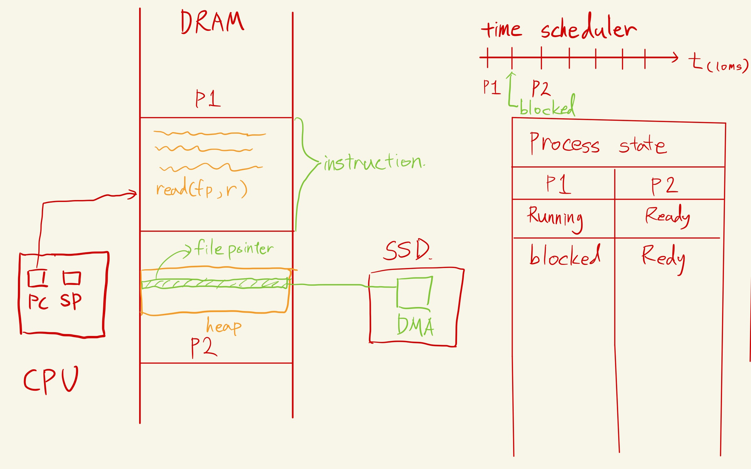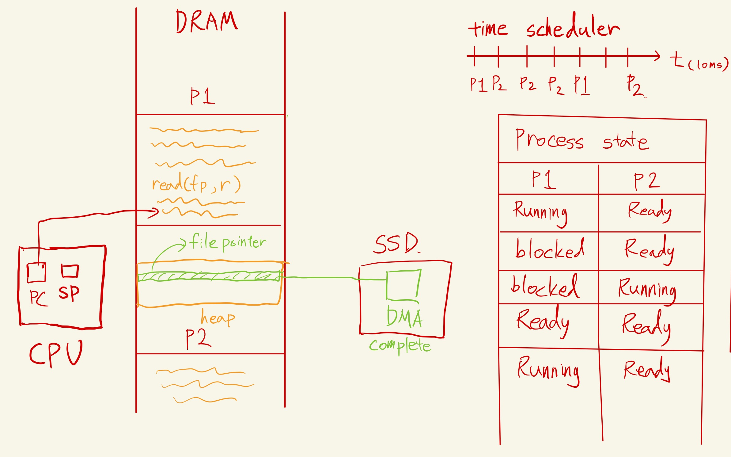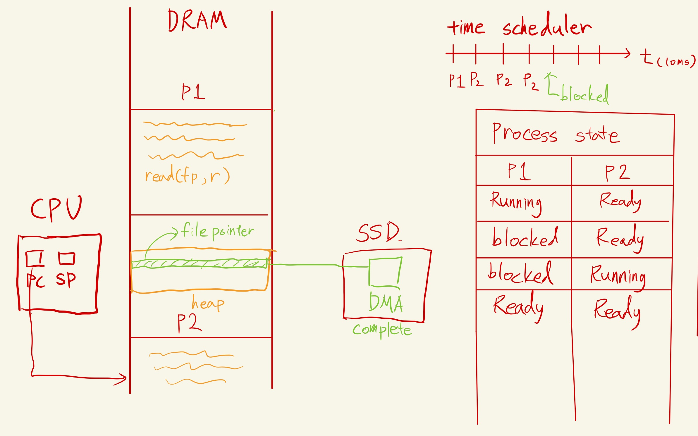 time scheduler는 p2를 앞당기고 실행시킨다. SSD카드에서는 filepointer에 주소를 할당해주기 위해 DMA(Direct Memory Access)가 주소를 찾고 있는 중이다.