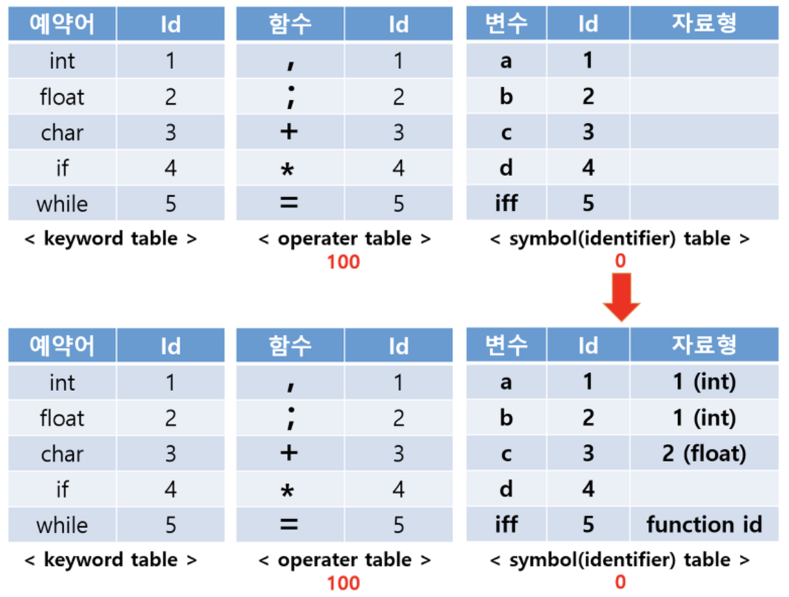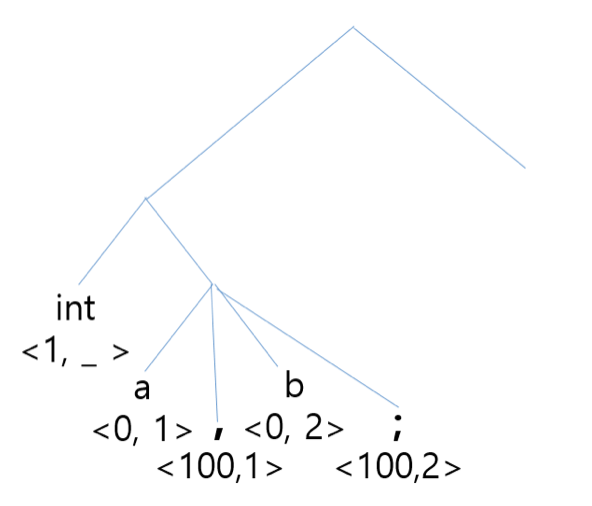 생성된 테이블을 바탕으로 tree를 만드는데 여기서 'c = b a'나 'a+b=c'와 같은 경우는 tree를 못 만들기 때문에 Syntatic Error가 발생하게 된다. tree를 parsing하면서 자료형을 symbol table에 입력한다.