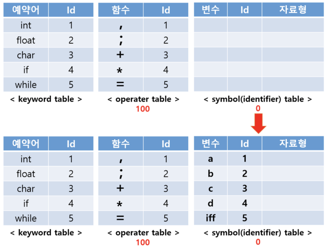 위의 예시를 Lexical Analysis 해서 table에 저장한 결과이다. 이 때, 2a를 분석하는 경우에 Lexial error가 날 것이다. d는 자료형이 없지만 이 과정에서는 에러가 나지 않는다.(5번의 경우 +를 빼줘야 한다! 잘못 만듦)