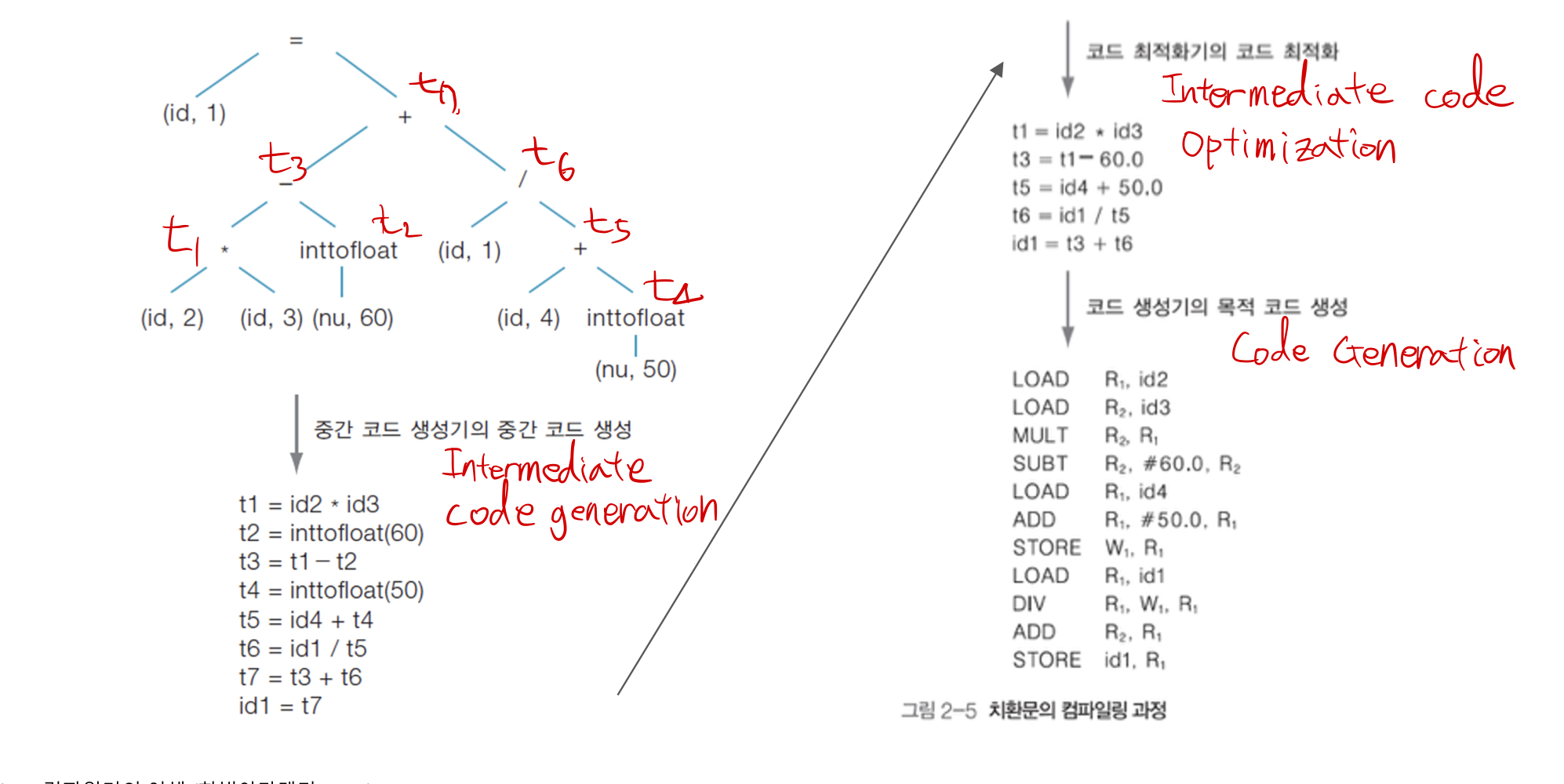 5. Intermediate Code Optimization - 코드의 실행 시간을 줄이거나 메모리 소모량을 줄이기 위해 코드 최적화를 수행한다.