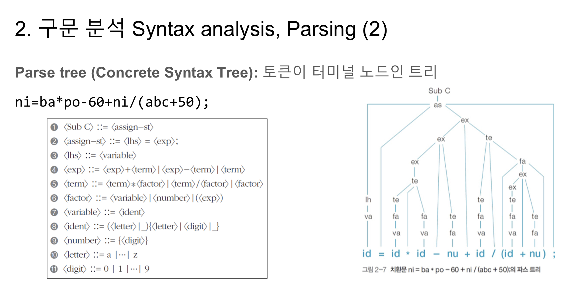 2. Parsing = Syntax Analysis(구문 분석) - 추출된 token들이 문장의 구성 요소 가운데 어디에 해당하는지 확인한다. 확인하면서 Parse tree 또는 Syntax tree(구문 트리)를 생성한다.
