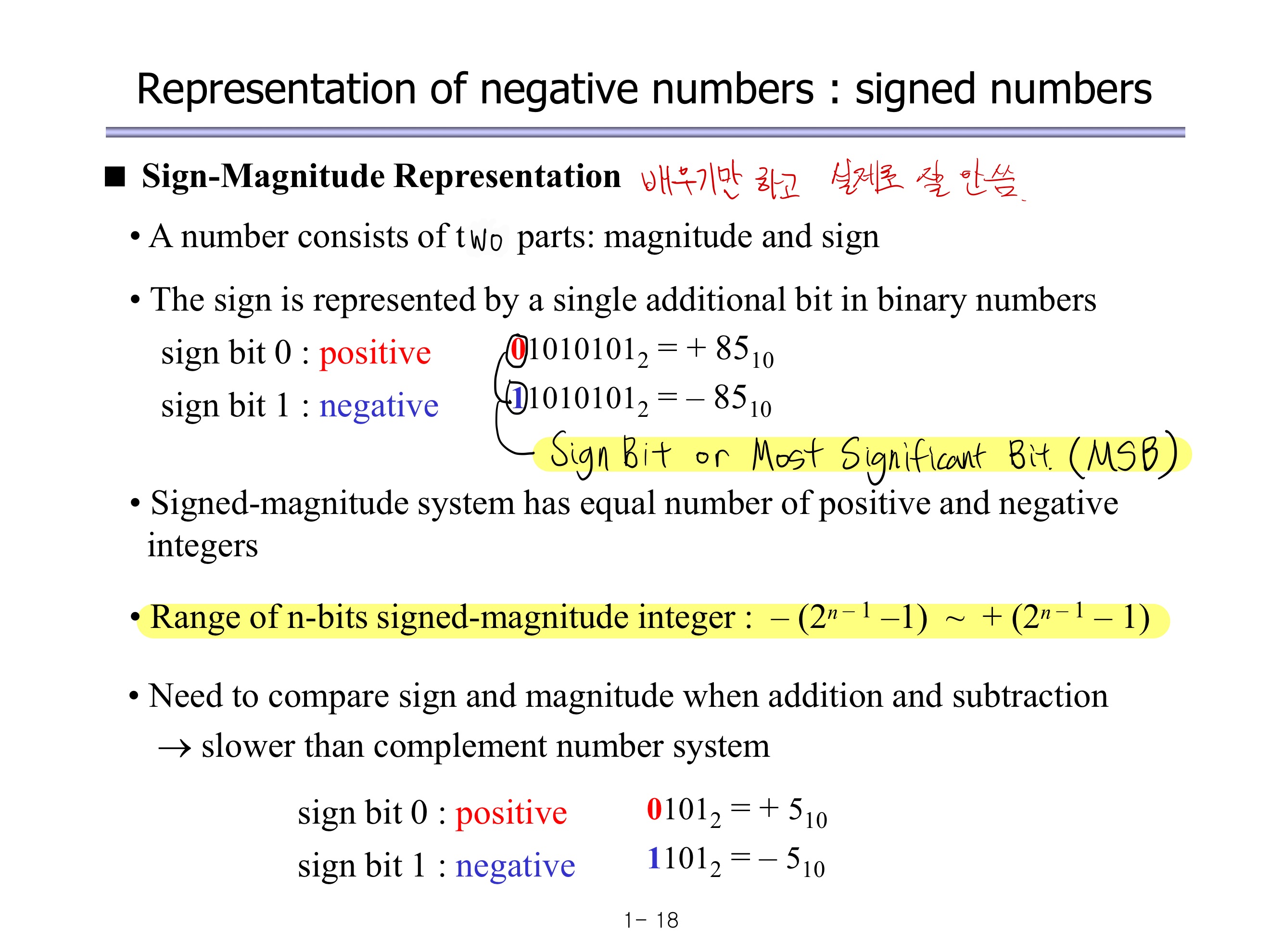 범위는 위를 참조하면 알겠지만 음수 부분과 양수 부분이 같다. Sign-Magnitude Representation은 음수인 0과 양수인 0으로 나눠지므로 사용하기 애매하기 때문에 실제로는 잘 사용되지 않는다.