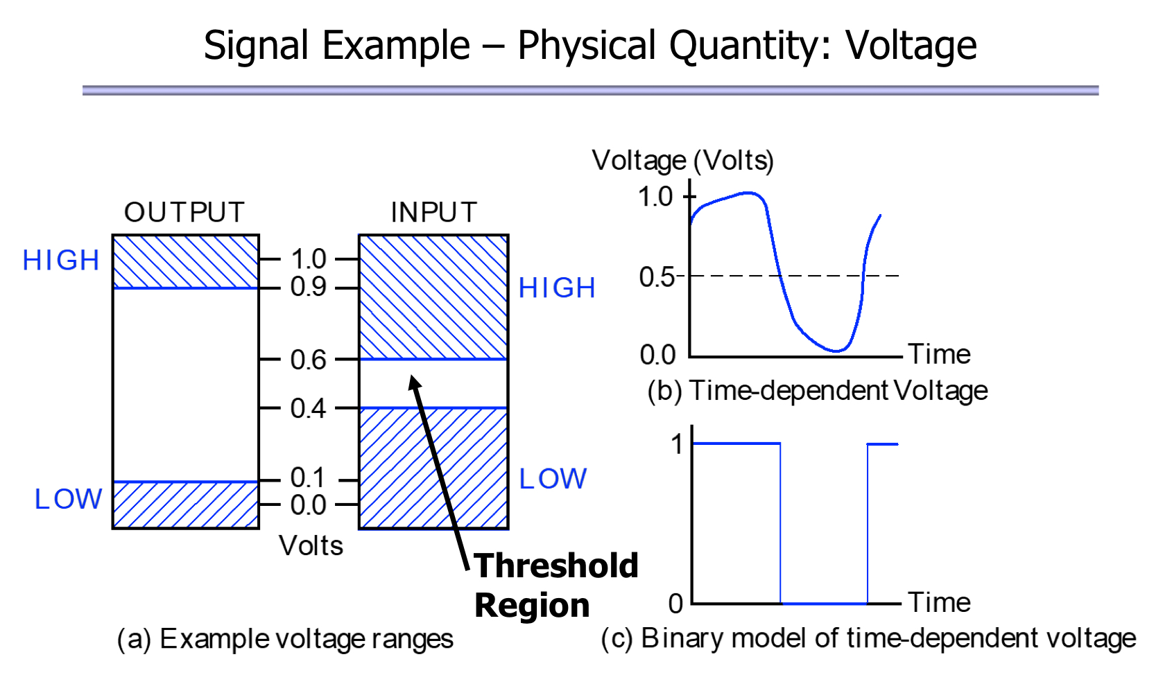 data가 physical적으로 input 될 때는 많은 noise가 껴있기 때문에 output과 비교하여 꽤 여유 있는 범위를 이용해 High와 Low를 구별한다.