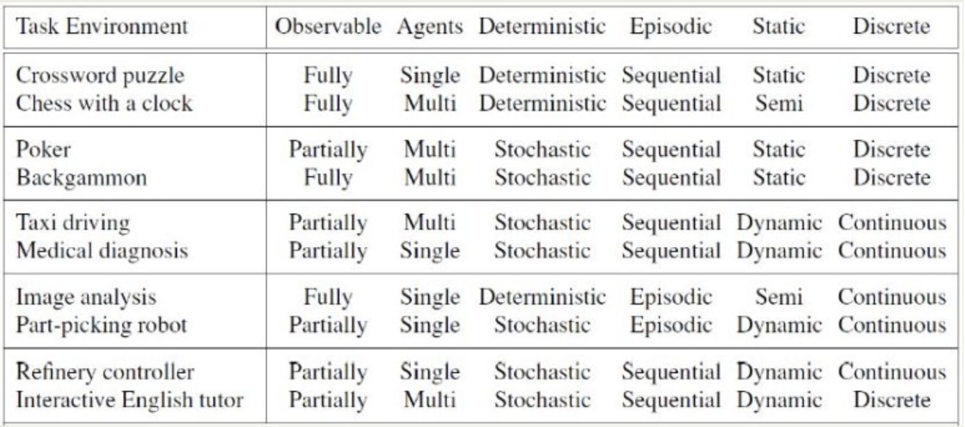 예를 들어 자율주행을 agent가 수행해야 한다면 performance measure은 안전성,경제성,합법성,편리성 등이 되고 Environment는 도로가 될 것이다. Actuators는 자동차가 움직이는데 필요한 장치들(브레이크, 엑셀, 바퀴 등)이 될 것이고 Sensor는 GPS, engine sensors 등이 될 것이다.