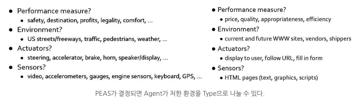 PEAS란 rational agent가 처한 상황을 알 수 있게 해주는 기준이다.