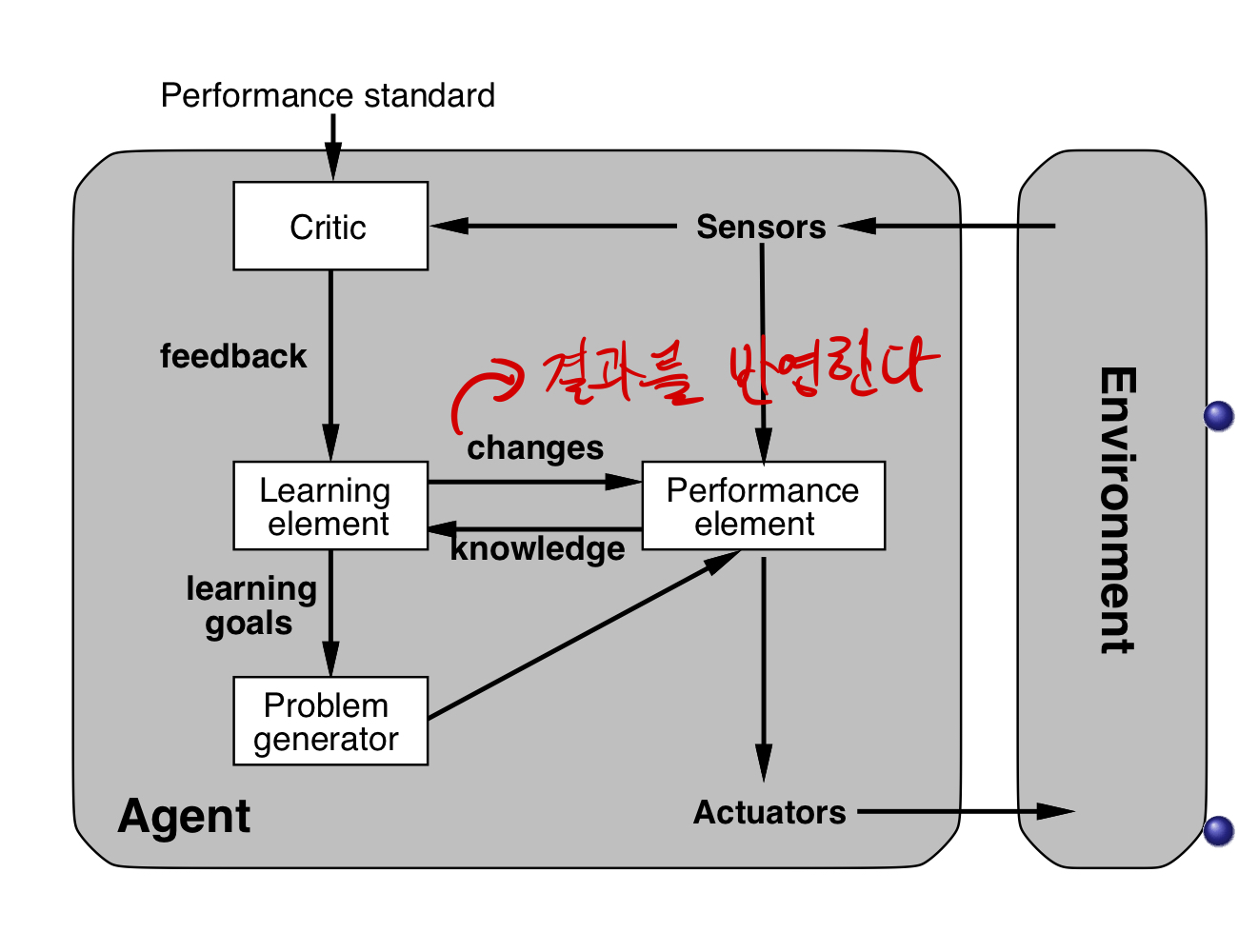지금까지 4가지 Learning 가능한 Architecture들에 대해 알아보았다. Condition, Action, Rule을 업데이트 하고, Goal을 Redefine하고, Goal을 성취해 나가는 과정에서 Model Parameter를 조정한다. Learning은 기본적으로 Sensor로 받는 perception과 agent가 생각하는 performance standard간의 Critic으로 부터 feedback을 받아 learning element가 작동한다. 기본적으로 지식은 performance element 안에 내재되어 있고, 이것을 change하는 형태의 구조를 가지고 있다. 그 다음 경우에 따라서 utility로 가게 되면서 learning goals를 해야 하고, 이것이 발생하면 풀고자 하는 problem이 생기고, 이것을 바탕으로 perfomance element를 조정 할 수 있게 된다. 이러한 전 과정의 구조를 Learning Element의 구조라고 부른다.