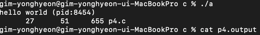 위의 코드를 실행한 결과이다. 중요한 점은 close(STDOUT_FILENO)인데 이것을 안하면 아래와 같이 c를 실행하는데 wc의 값이 나오게 되고 p4.output에는 아무것도 들어가지 않게 된다.
