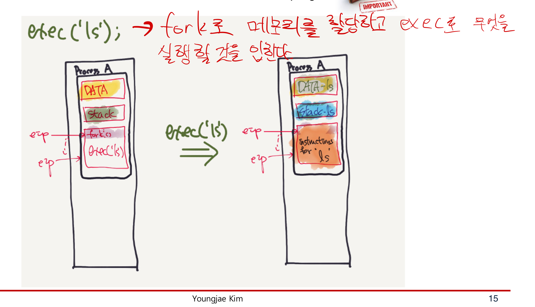 %ls -l 이 실행된다고 했을 때 shell은 fork()를 부르고 exec("ls","ls-l")이 된다.