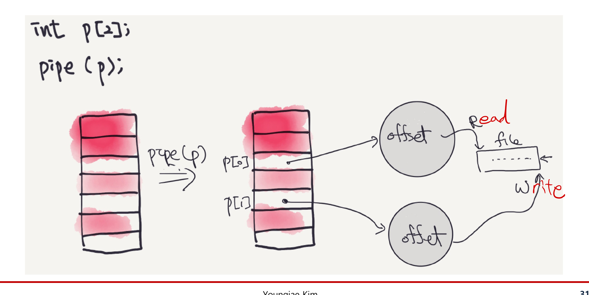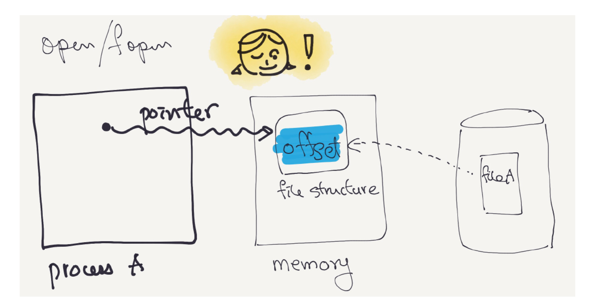 memory에 생성된 offset은 fileA에서 정보를 받아오고 있고 process의 pointer는 그 offset을 가리키고 있다.