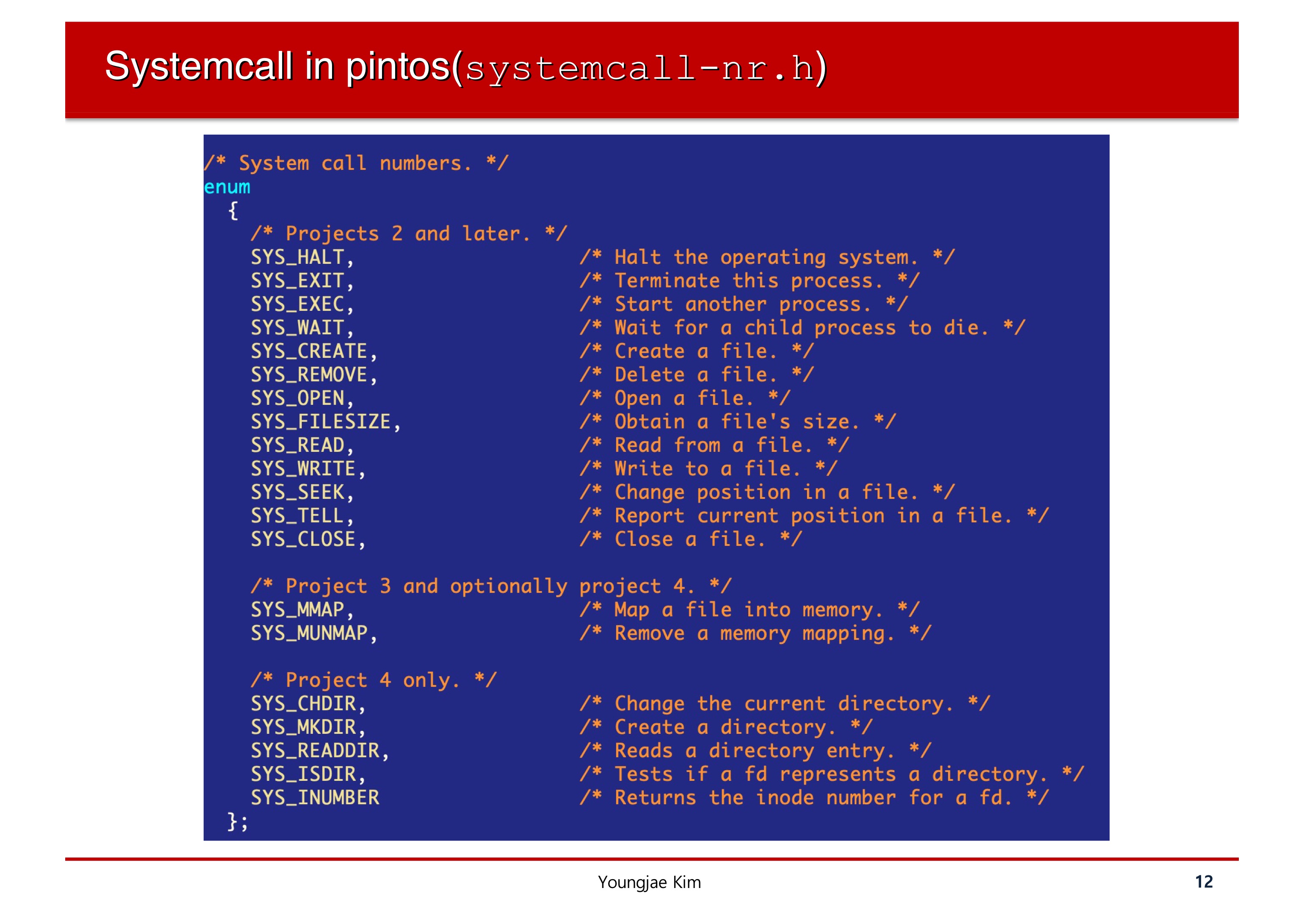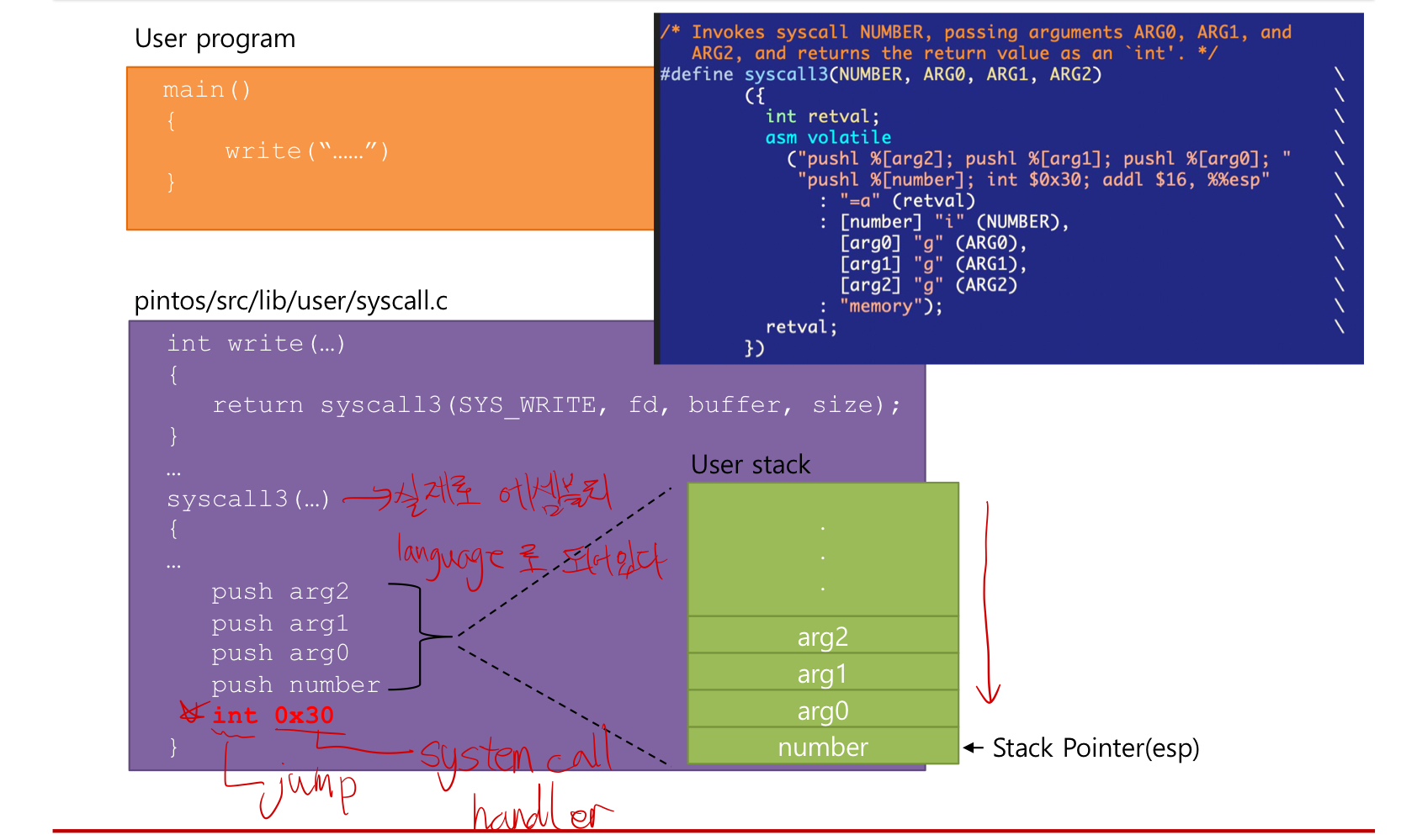 - int 0x30 을 한다.(Pintos일 경우만, 그리고 int는 interrupt를 의미한다)