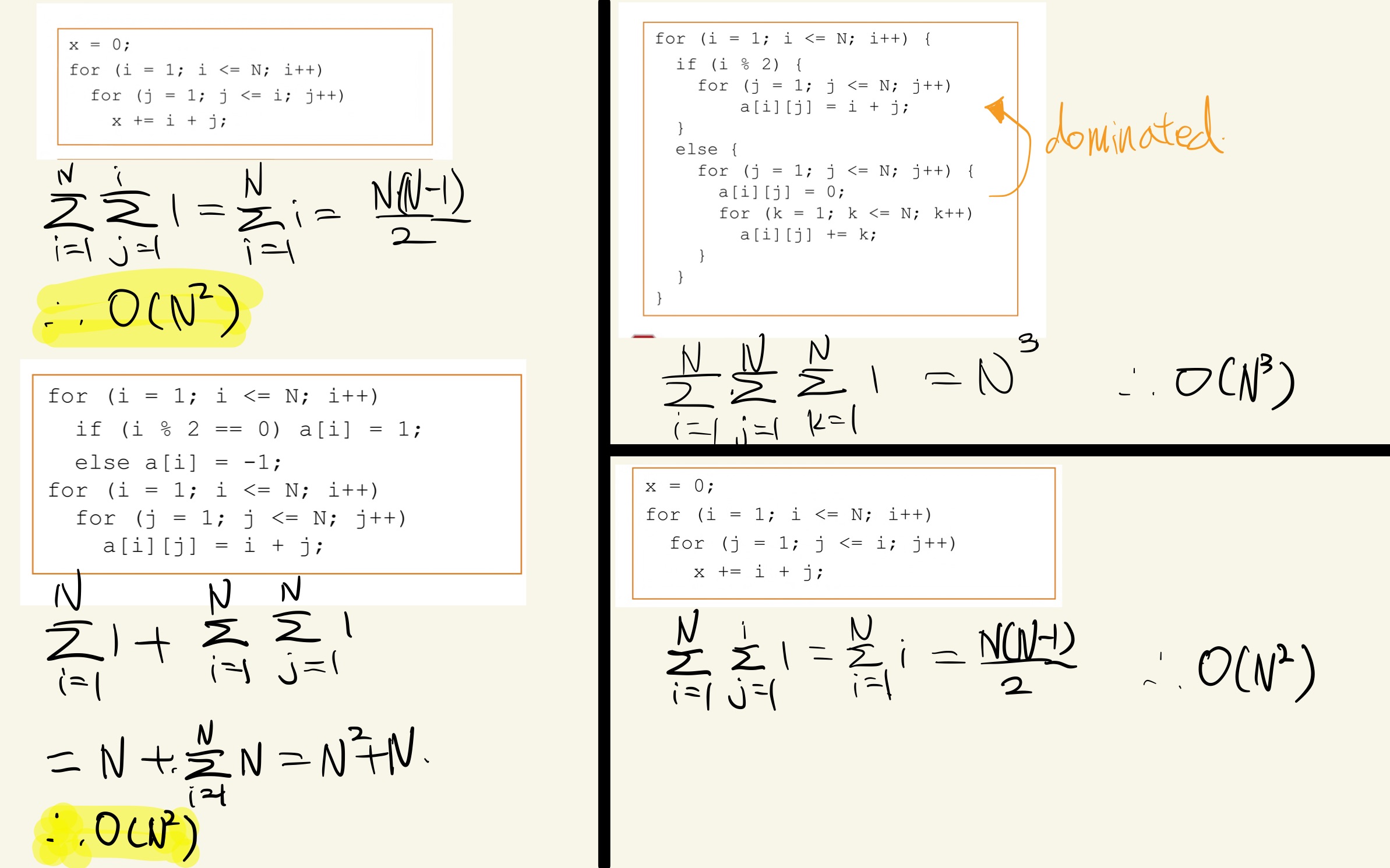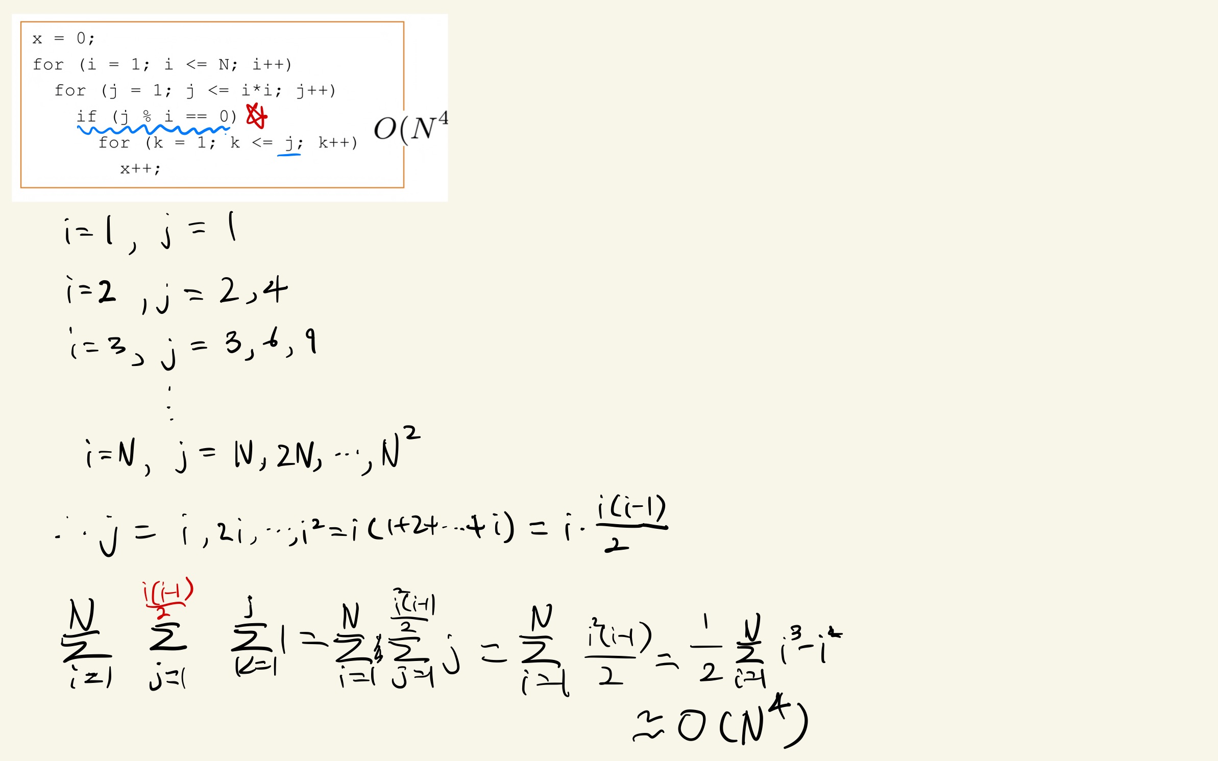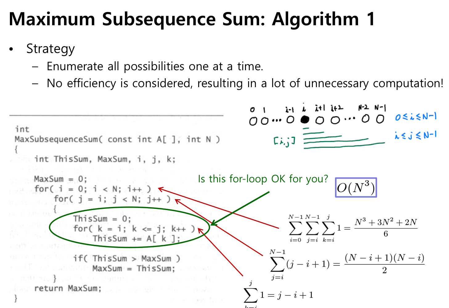0에서 부터 N-1까지 개수가 1,2,...,N개의 합을 구한다. 그리고 1부터 N-1까지 개수가 1,2,...,N-1개의 합을 구한다. 이를 N-1일 때까지 반복하는 것이다. 위에 시간 복잡도를 구하는 것을 보면 시간 복잡도가 O(N^3)이 나오는 것을 알 수 있다. 솔직히 이렇게 구하려고 생각하는게 더 힘든 거 같다...