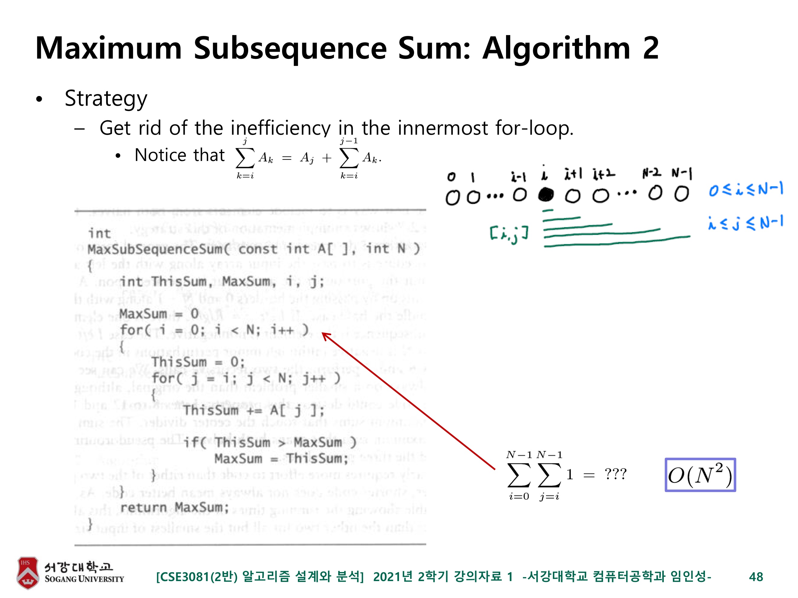 위 알고리즘은 i를 1씩 증가시키면서 i번째 부터 N번째 까지 더하면서 최대값일 경우 값을 갱신해주는 알고리즘이다.
