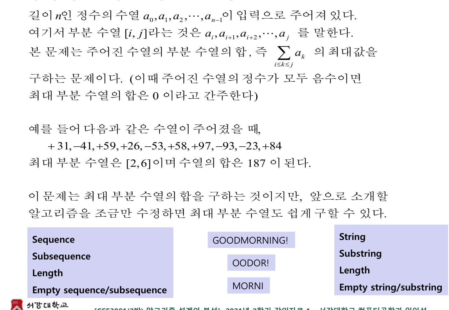 최대 부분 수열의 합 문제이다. 백준 1912번 연속합 문제와 똑같은 문제이다. DP로 해결하면 O(n)에 해결이 가능한다. 하지만 본 수업에서는 더 심도있게 이 알고리즘을 다루고자 한다.