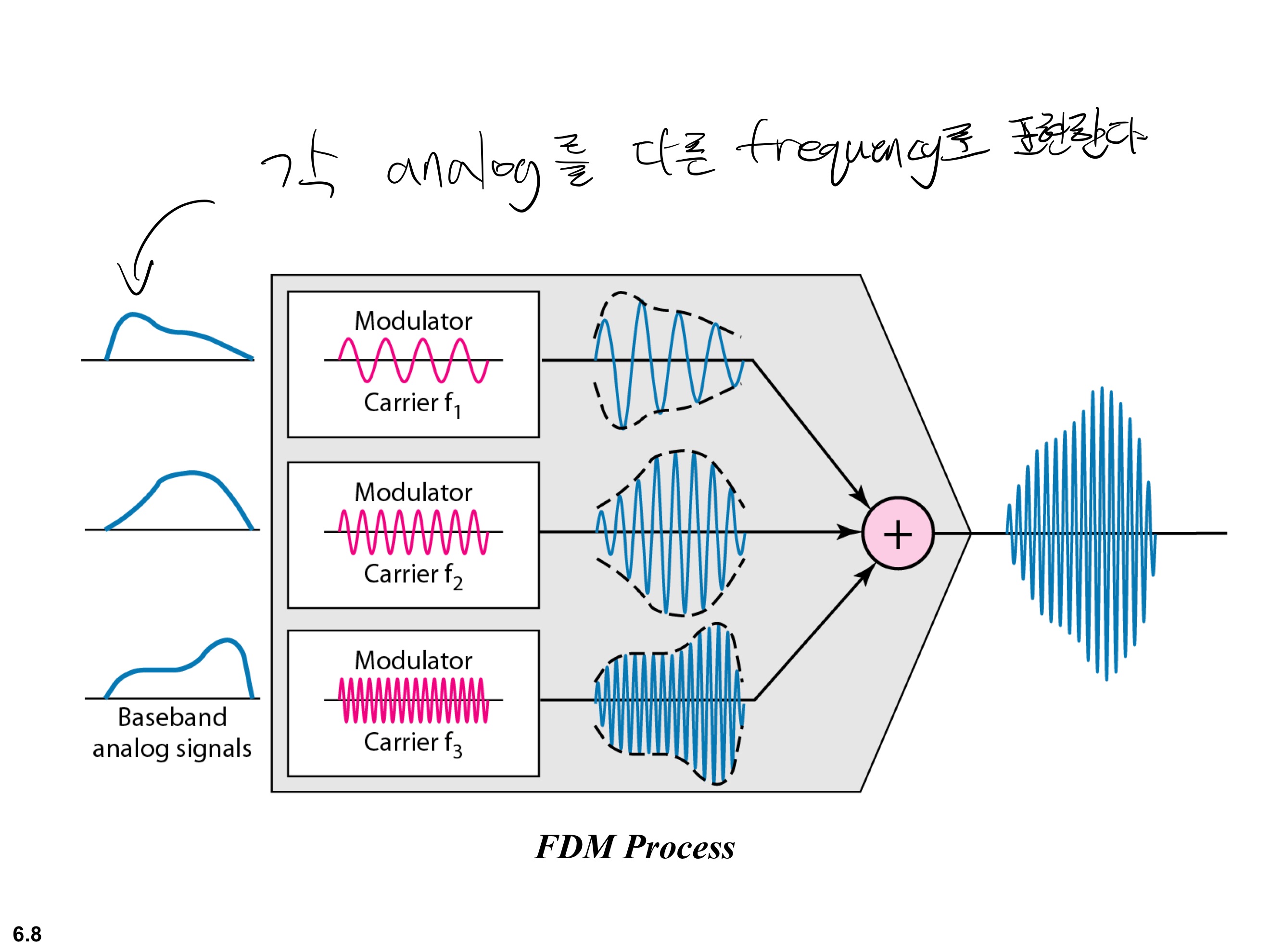 n개의 input을 받을 때, 각각 n개의 signal에 고유의 빈도수를 가진 modulator을 이용하여 치환하고 합친다.