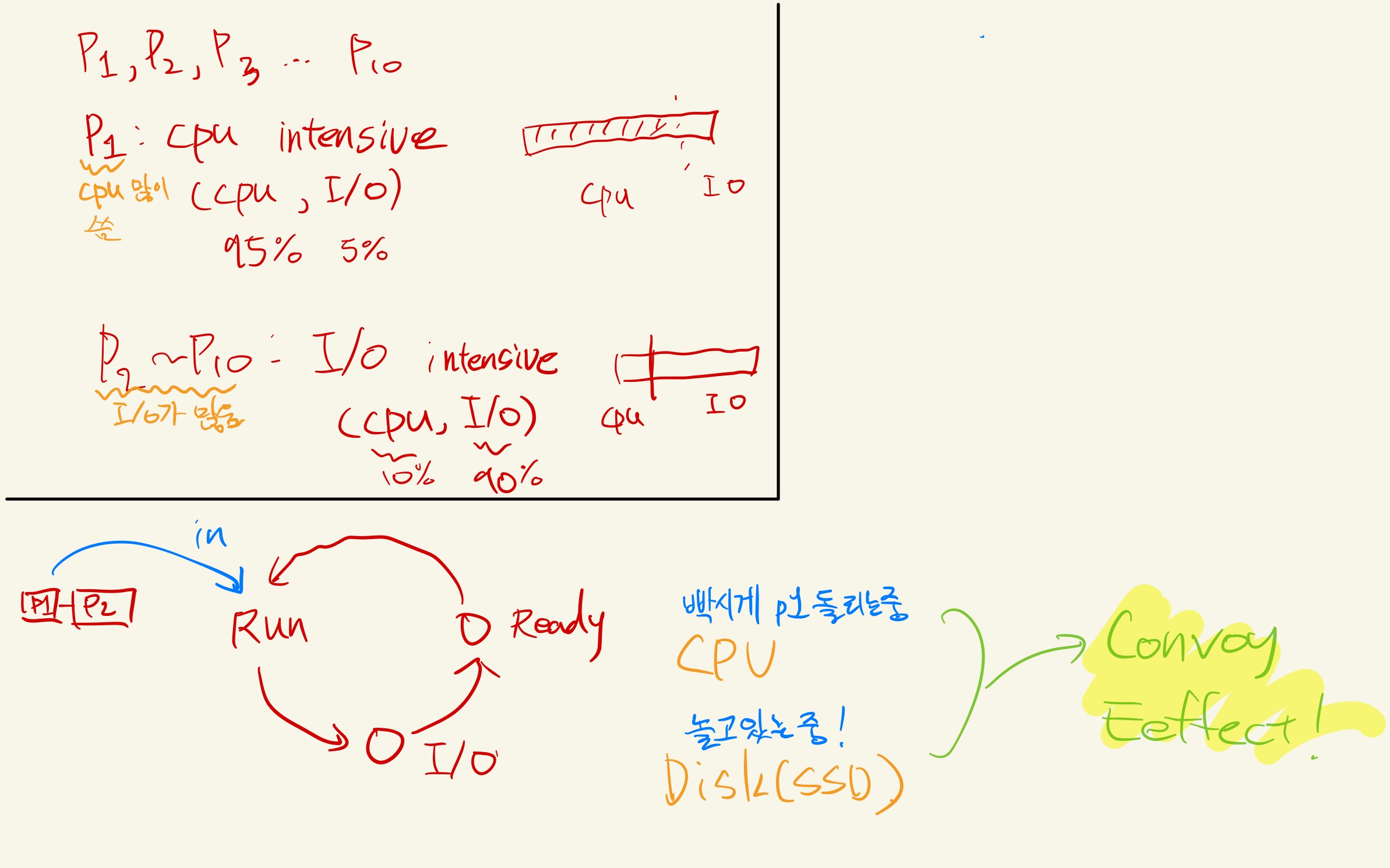 Convey Effect란, 예를 들어서 cpu intensive한 p1과 I/O를 많이 실행하는 p2~p10이 있다고 할 때, p1이 먼저 run할 경우에 p2~p10에서 SSD를 사용해야 하지만 p1이 실행 되는 긴 시간 동안에 SSD는 IDLE Time을 가지게 된다. CPU는 바쁜데 다른 하드웨어들이 놀고 있는 현상을 Convey Effect라고 한다.