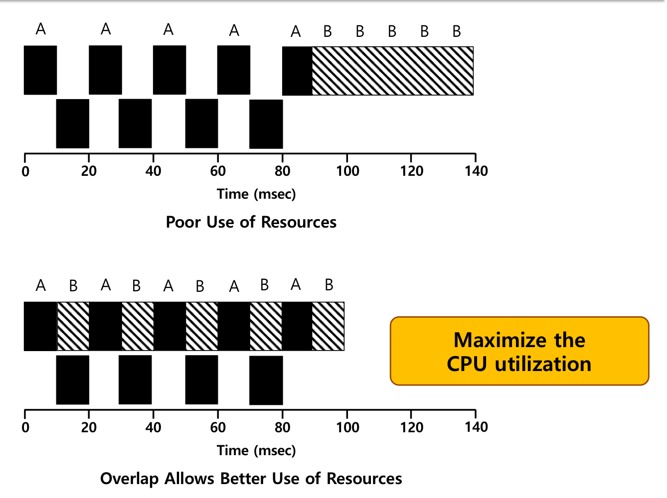 I/O가 있다면 당연히 첫 번째 처럼 scheduling하는 것보다 밑에 처럼 scheduling하는 것이 더 좋다.