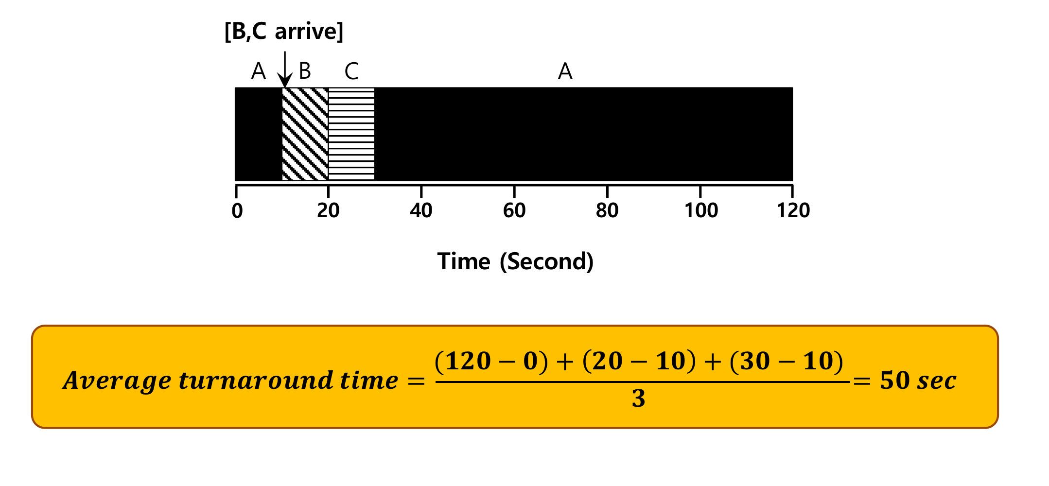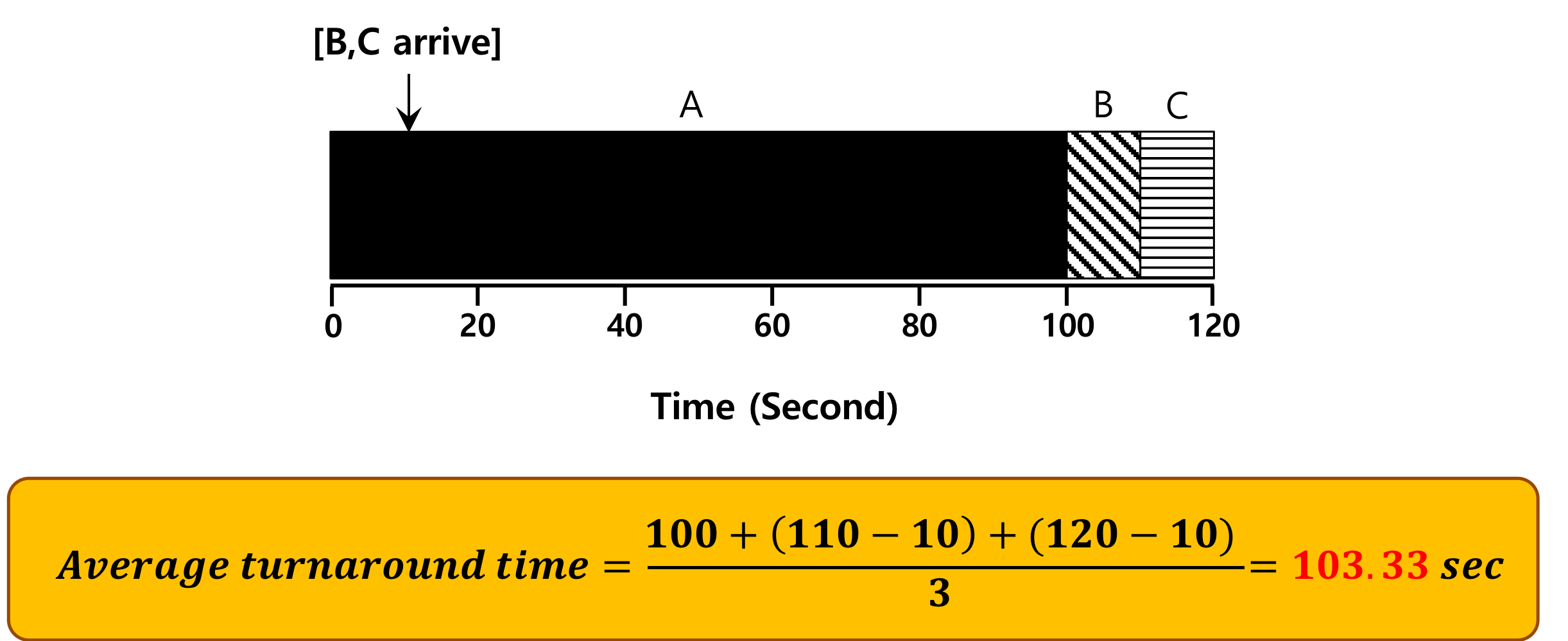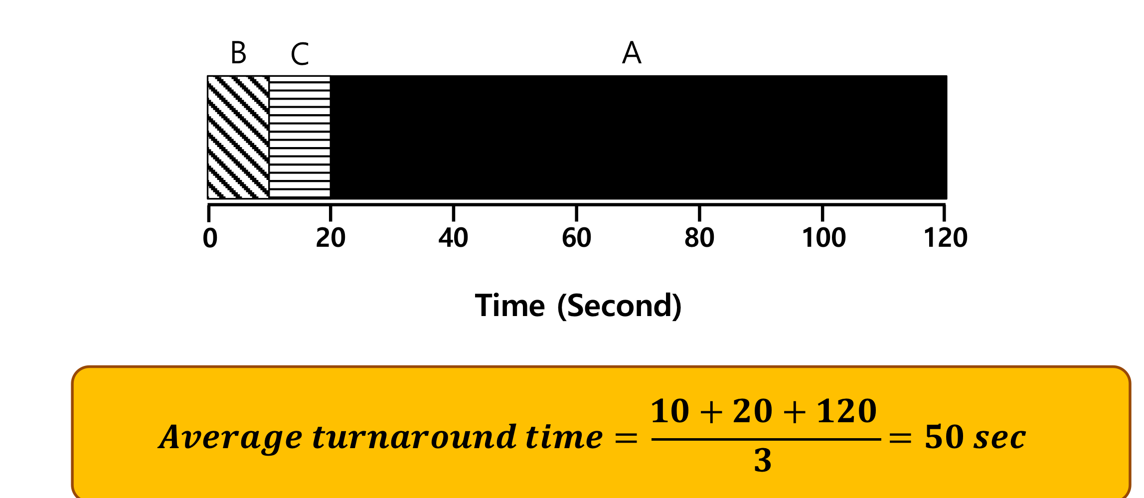 하지만 위에 같이 A가 먼저오고 B,C가 오는 경우에 또 Average turnaround time이 많이 늘어나게 된다.