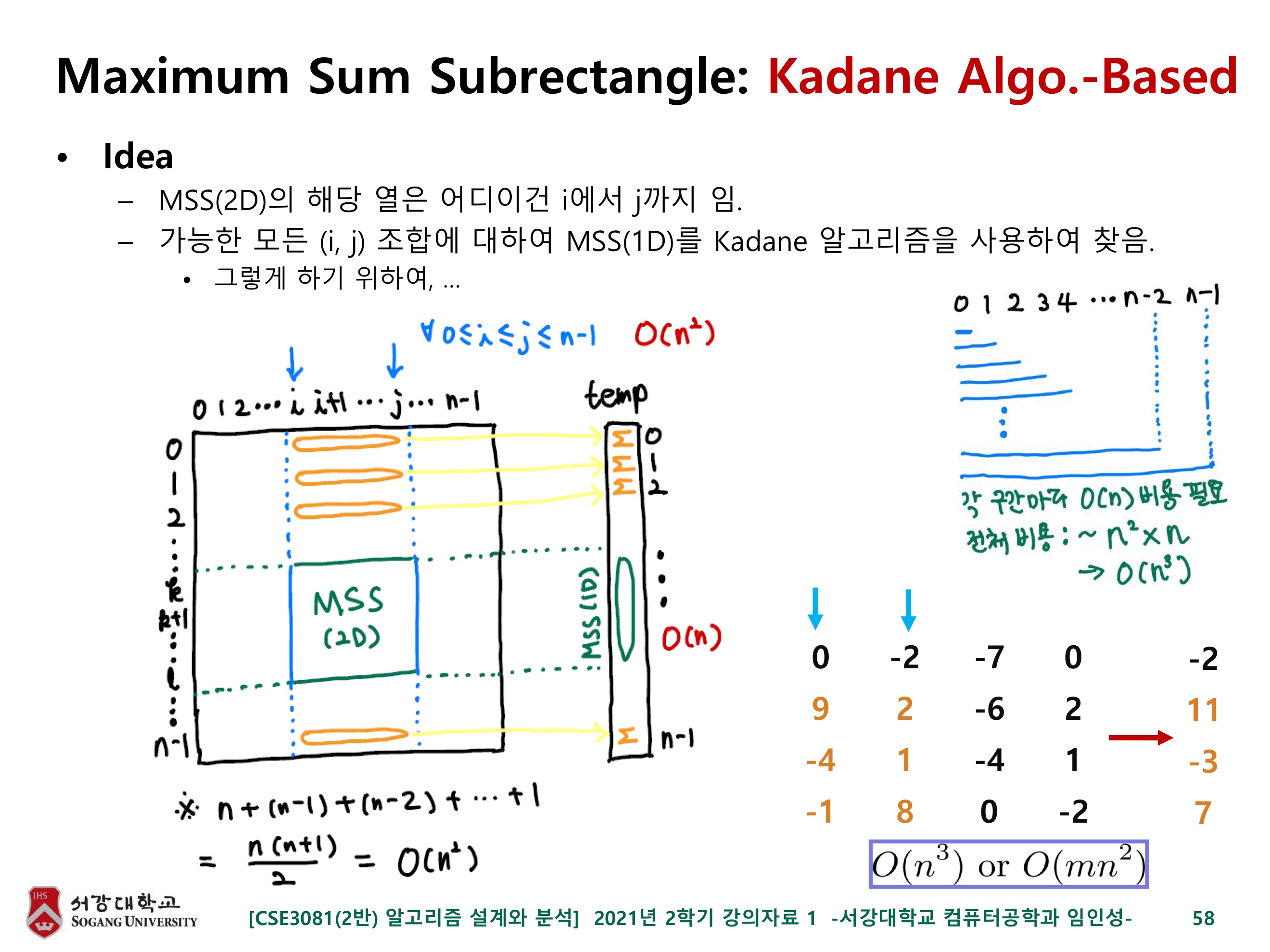 위 방식은 시간복잡도 O(n^3)에 풀 수 있는 문제이다. 탐색은 세로 방향만 탐색하고 가로로 내려가면서 Kadane 알고리즘을 써서 최댓값을 구하는 방식이다.