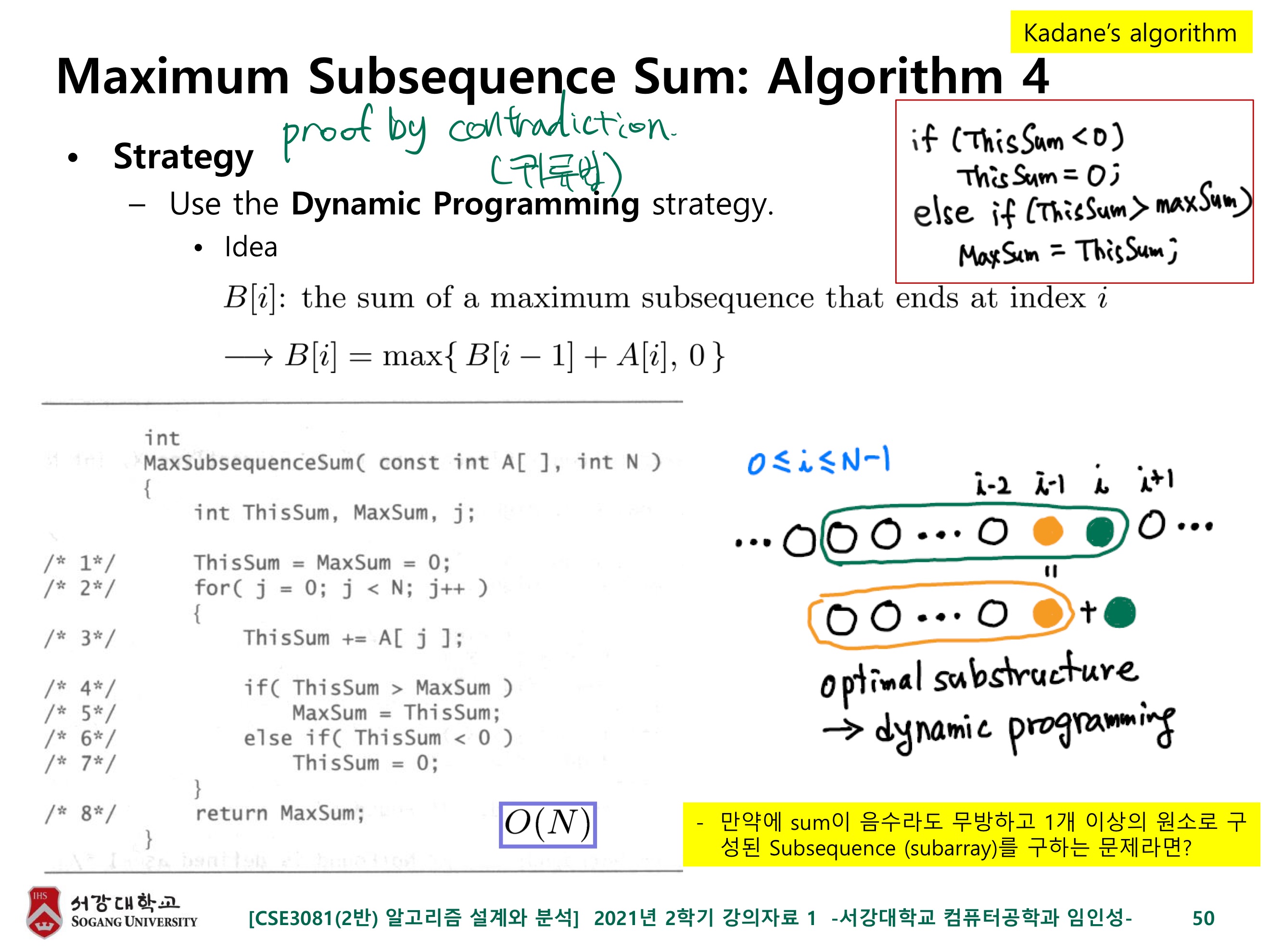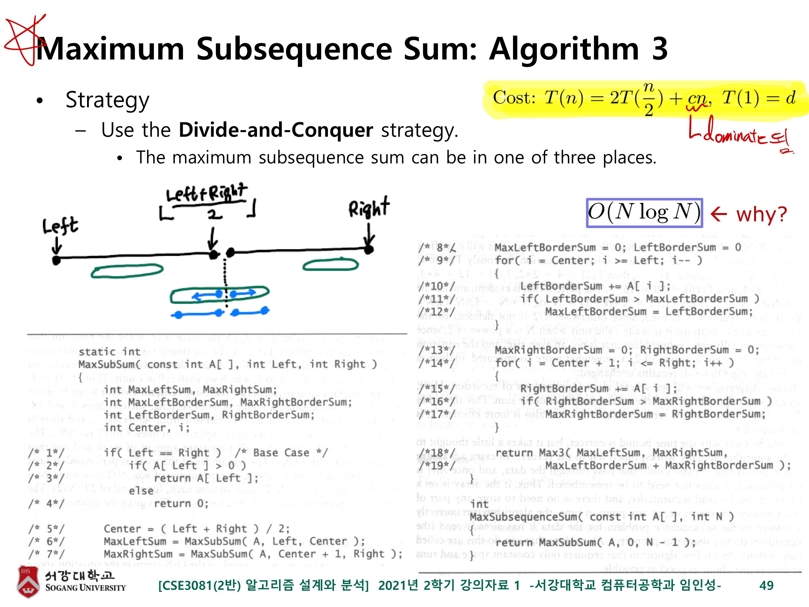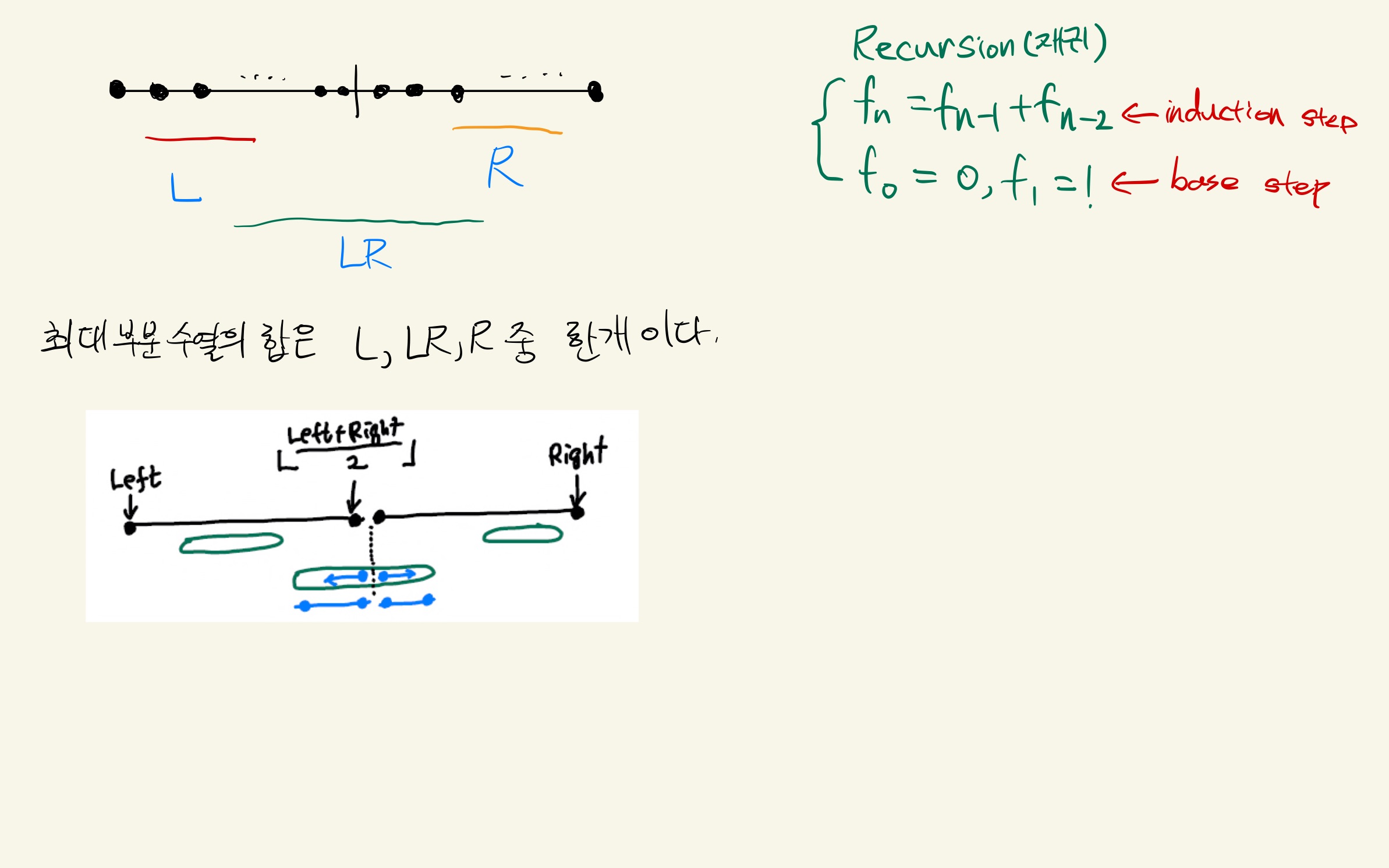 MSS는 위에 그림에서 L,R,LR 중 하나의 경우로 존재할 것이다. Divide-and Conquer로 Recursive하게 풀면