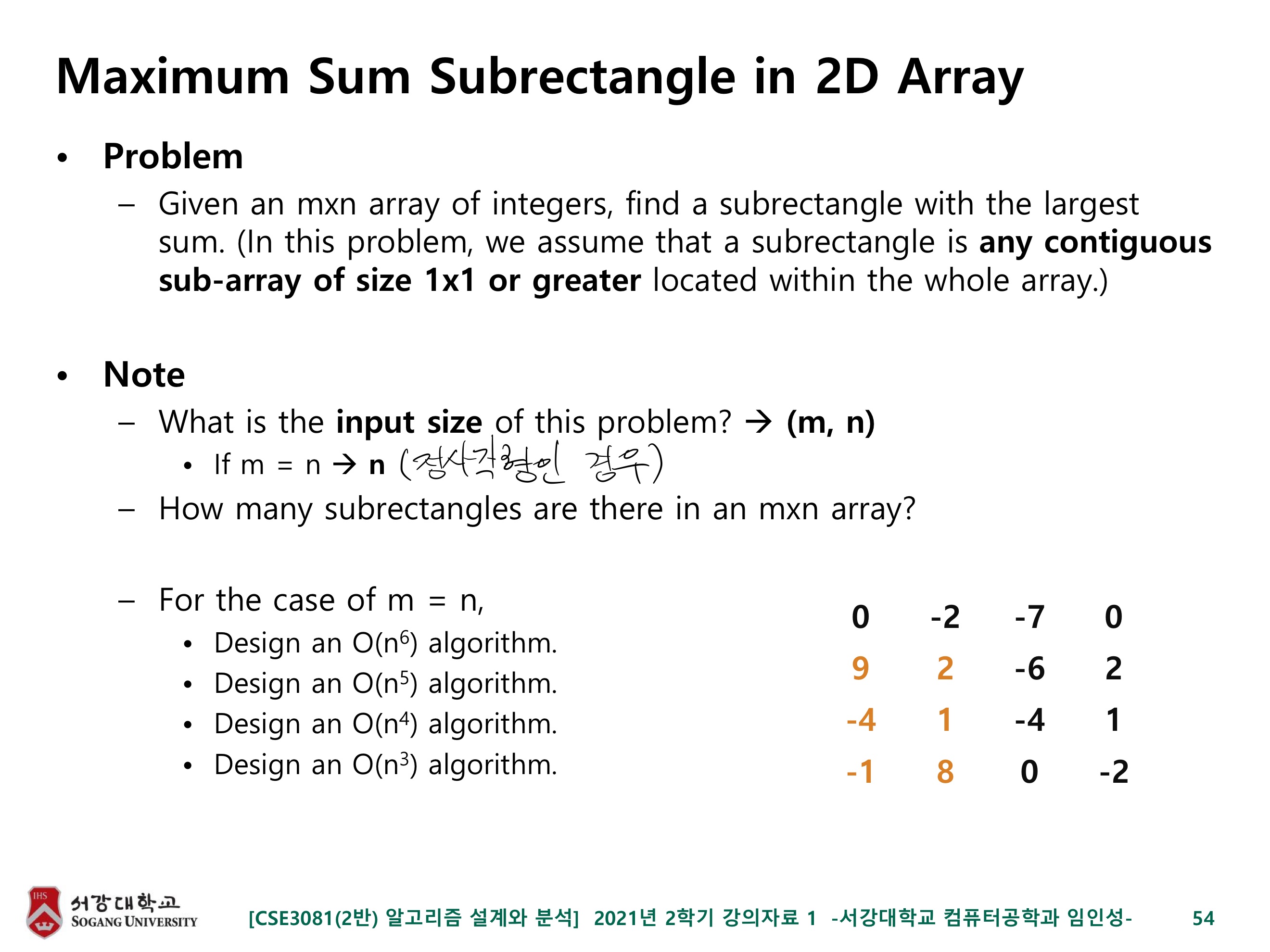 크기가 n*n의 2차원 배열에는 약 1/4*n^4개의 subrectangles가 있다.