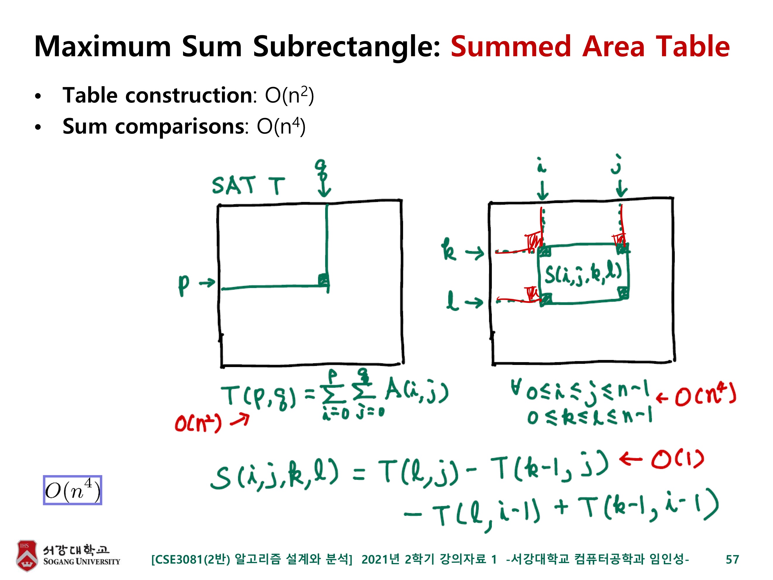 단순하게 모든 경우의 수를 더하는 것은 가로 세로 각각 탐색이 O(n^2), 합을 구하는 것이 O(n)이므로 총 O(n^2*n*n^2*n) = O(n^6)이 된다.