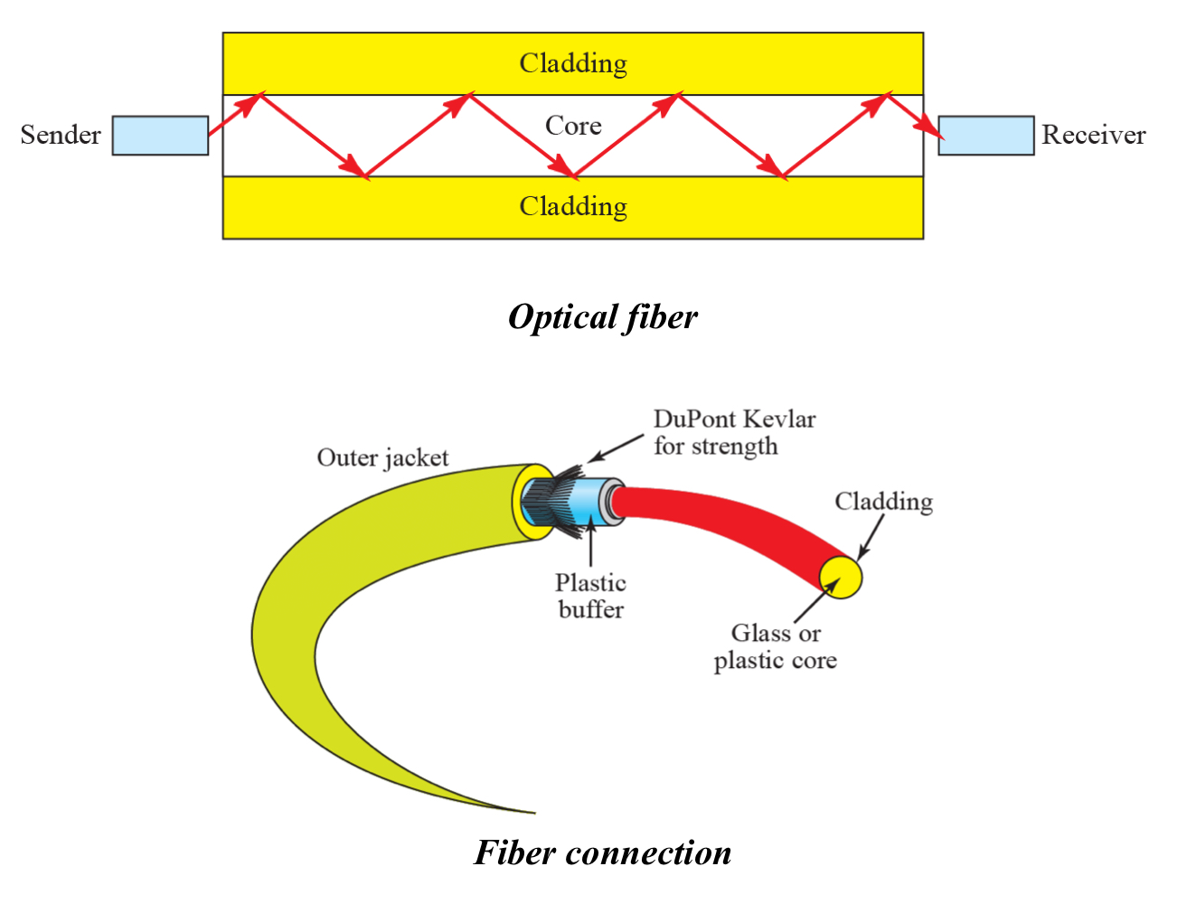 Fiber-Optic Cable은 주로 유리나 플라스틱으로 만들어지는데 깨지기 쉽기 때문에 보통 땅 밑에 매장하여 설치한다. 빛은 frequency가 높아 직선 성질이 강하기 때문에 single uniform substance를 통과할 때 직선으로 움직인다.