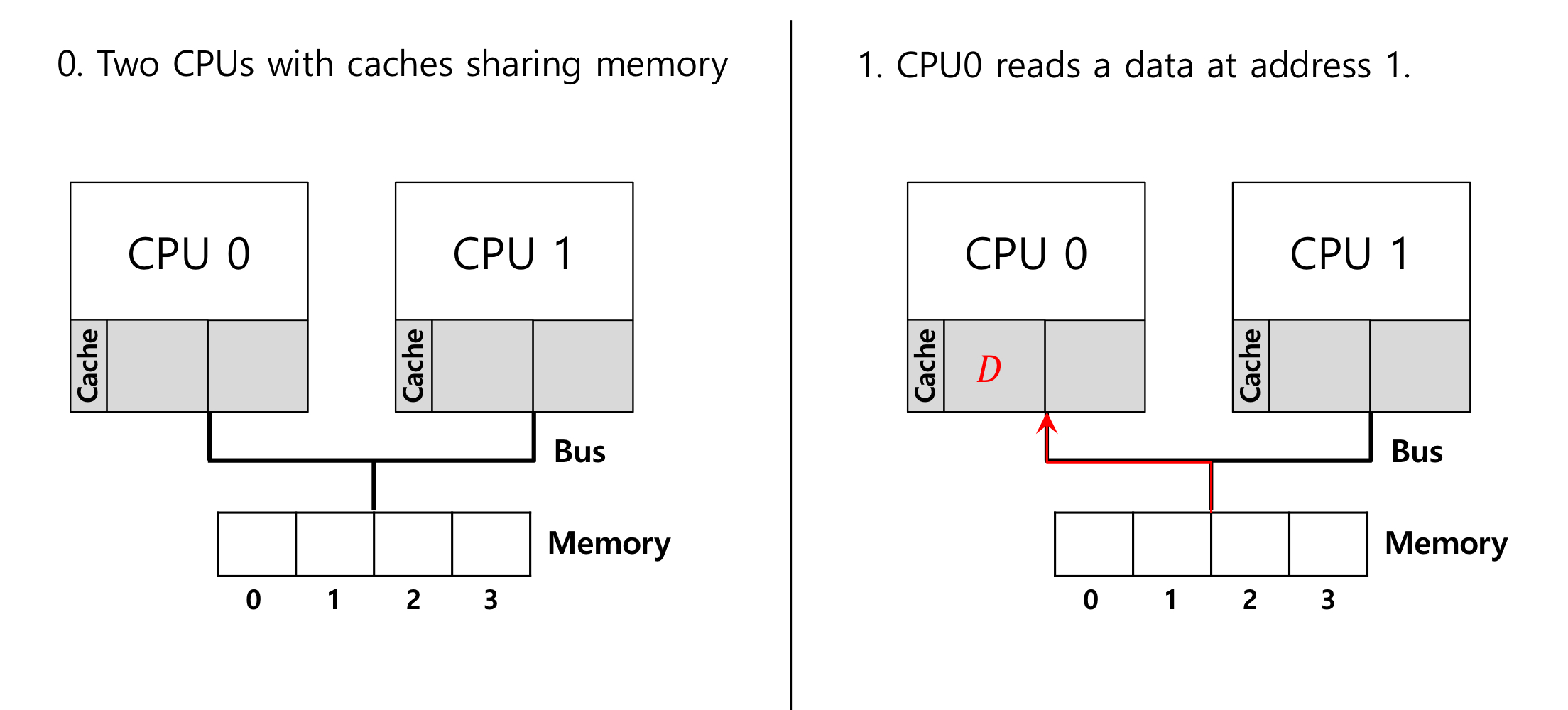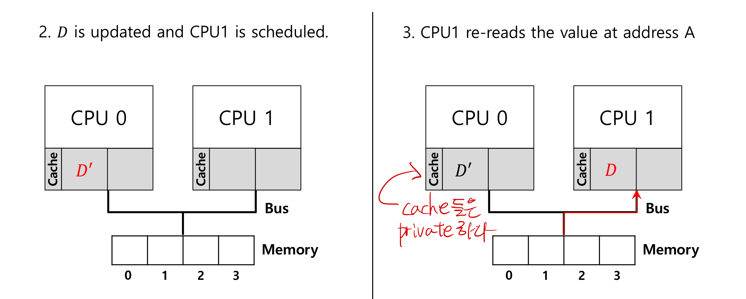 CPU 0과 CPU 1이 data D를 다룬다고 할 때, 각각의 cache들은 private한 성질을 가지고 있으므로, CPU 1은 update 된 D'가 아닌 D를 가져오게 된다. 따라서 CPU에서 update data를 cache에서 발견했을 때, 바뀌었다는 것을 알려주고 invalidate 해주거나 update 해주어야 한다.