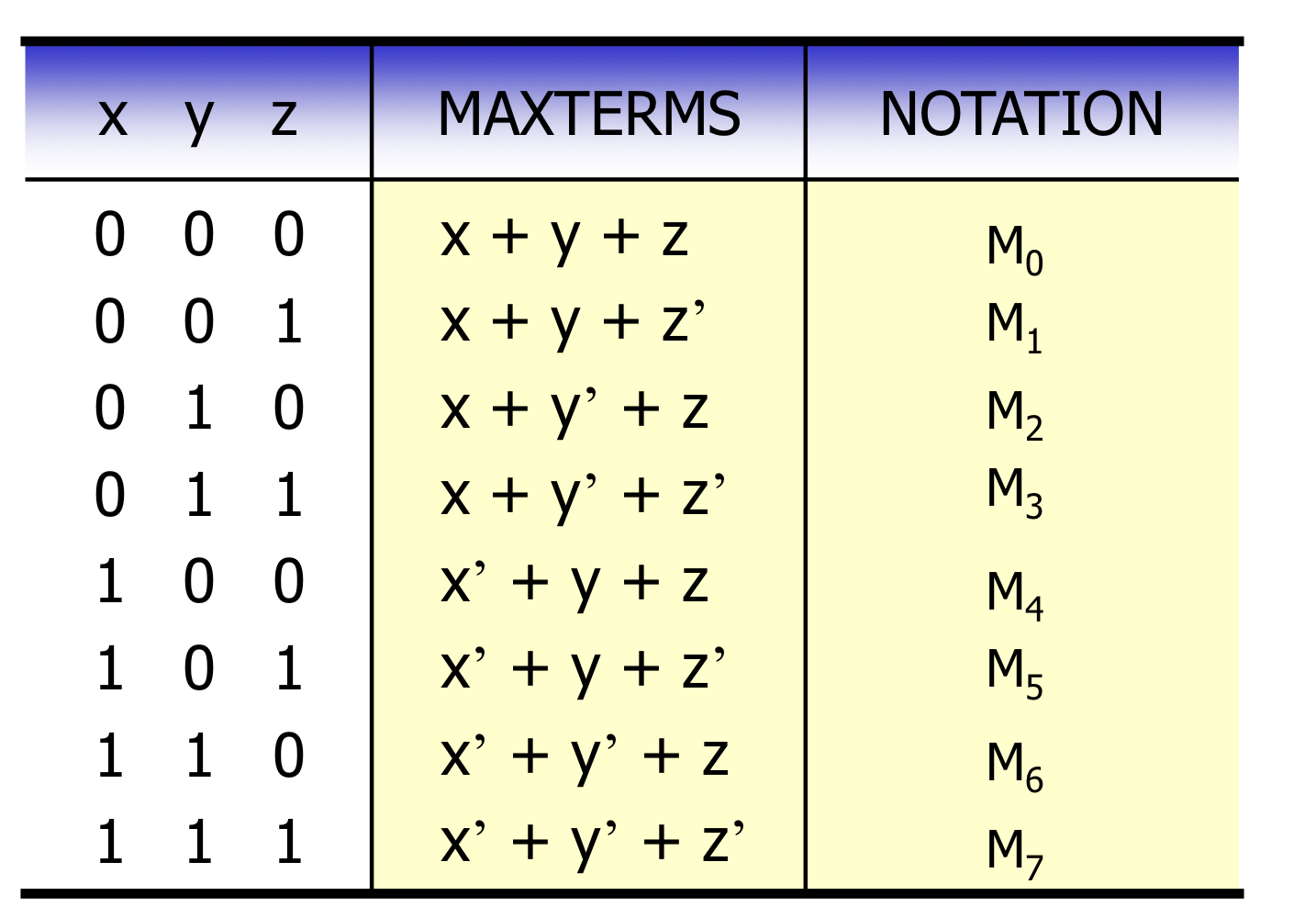 Maxterms은 Minterms와 다르게 변수들의 합(or)연산으로 이루어져있다.