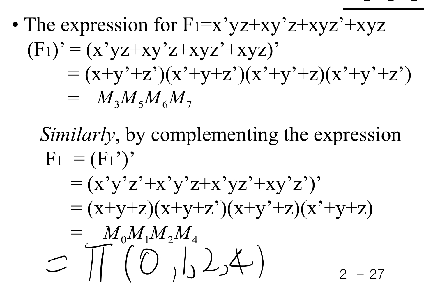Maxterm의 F1은 Maxterm들의 곱(and)연산으로 이루어져있다. 또 곱 연산으로 이루어져있기 때문에 0-maxterms로 모든 Boolean function을 표현 할 수 있다.