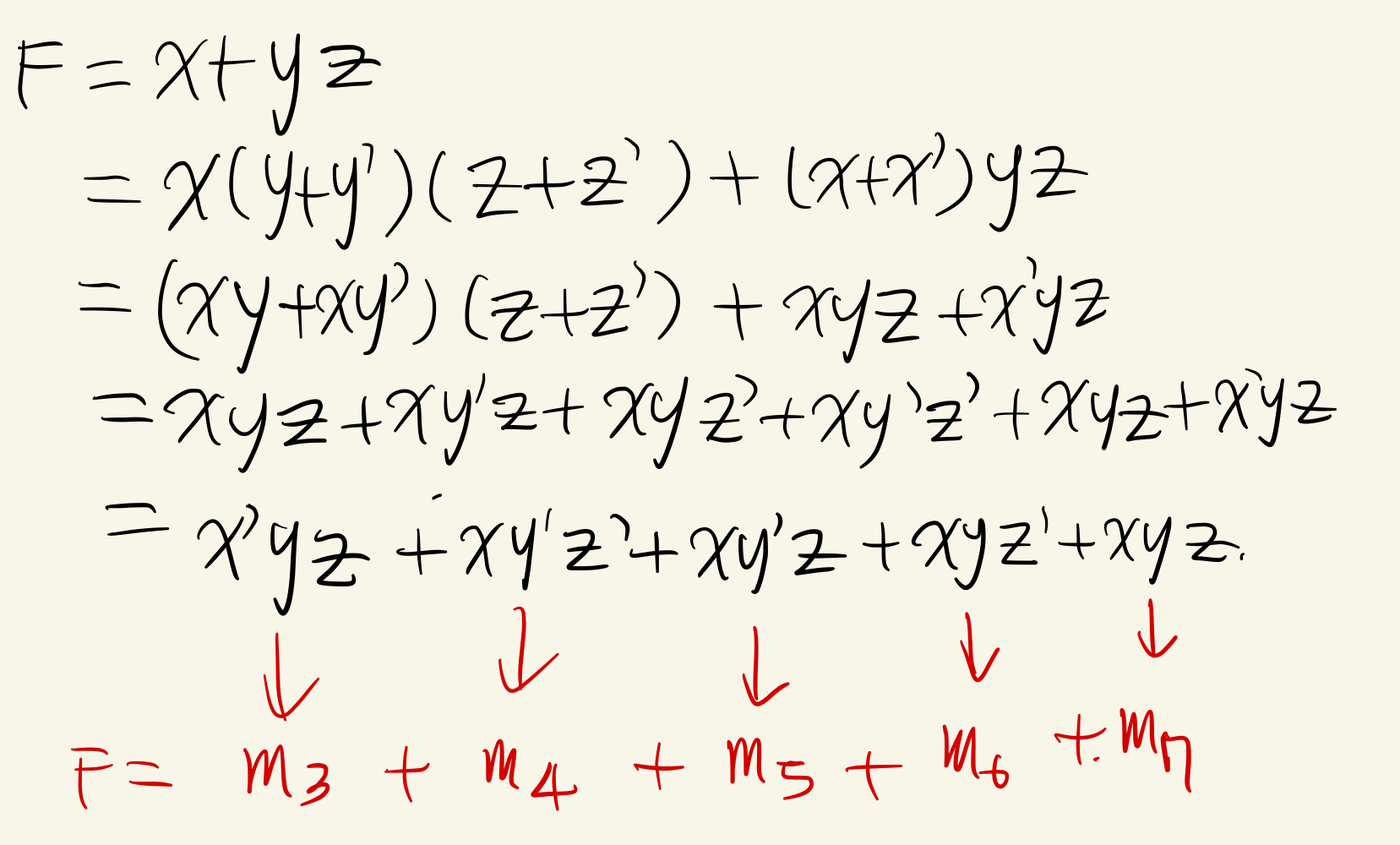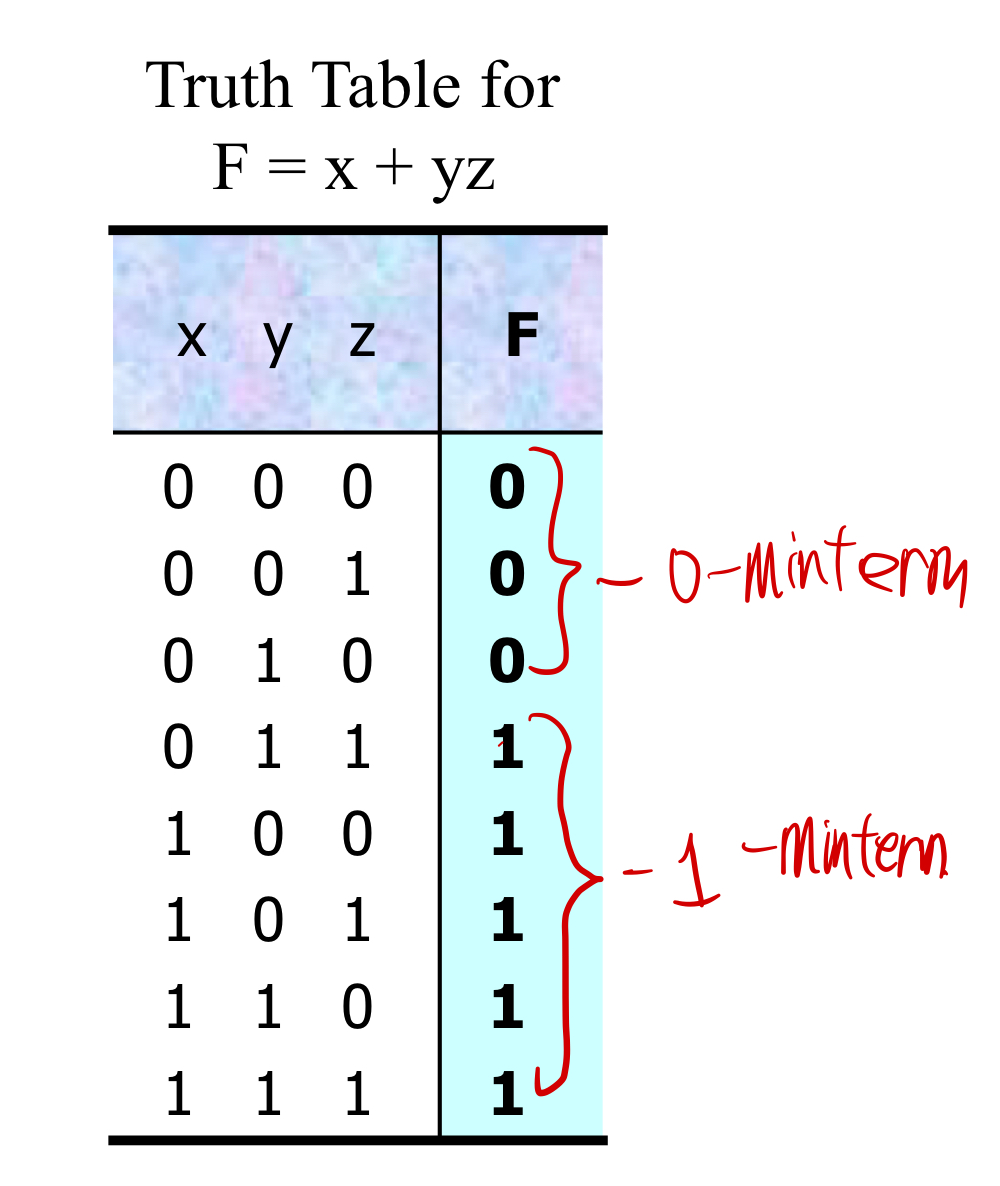 Minterm은 위 처럼 3개의 변수로 이루어져 있을 때, 그들의 곱(and) 연산으로 이루워지게 되고, 2^3으로 8개가 나오게 된다. 그리고 각각의 minterm에 notation을 붙이게 된다.