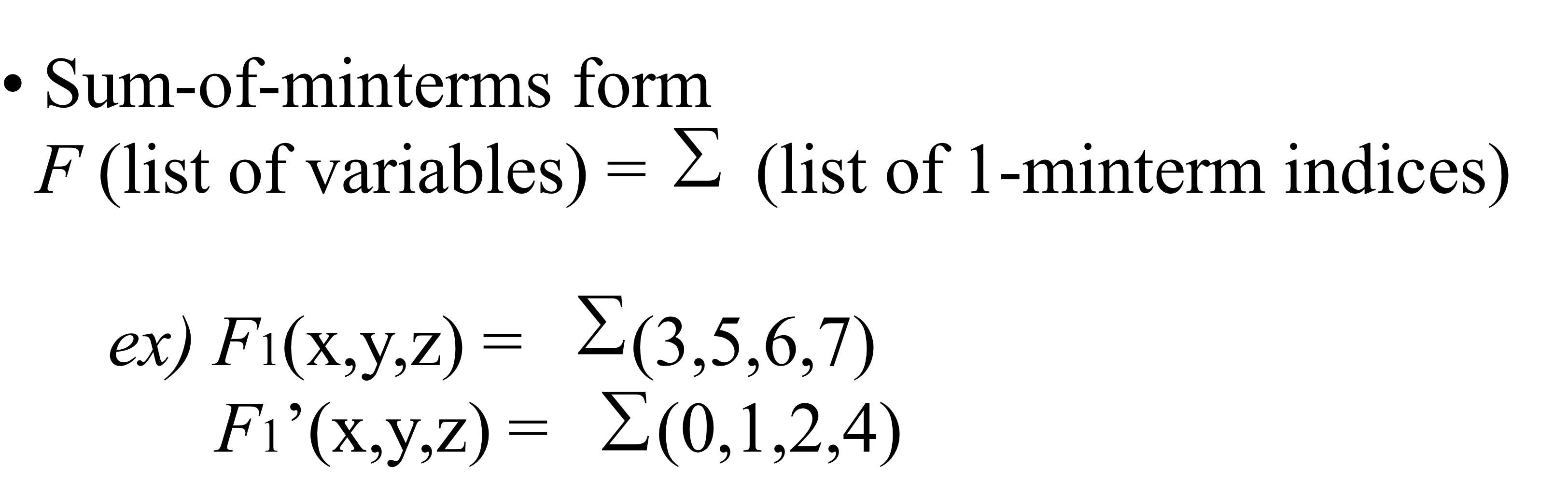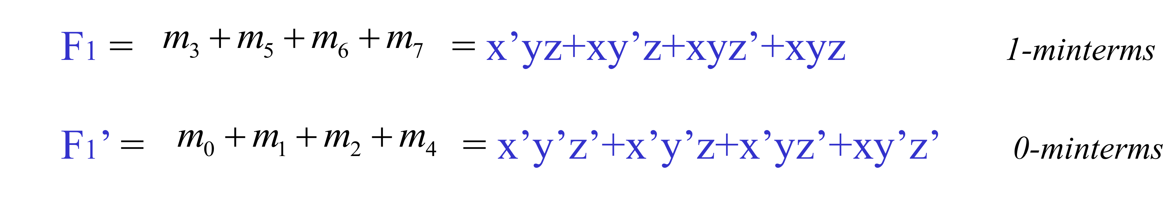 F1(Sum of minterms)인 경우에는 1이 나오는 경우이므로 1-minterms라고 하고 F1'은 0이 나오는 경우이므로 0-minterms라고 한다. 당연히 둘은 complement하다. 그리고 F1은 합(or)연산으로 이루어져 있기 때문에 1-minterms로 모든 Boolean function을 표현할 수 있다.