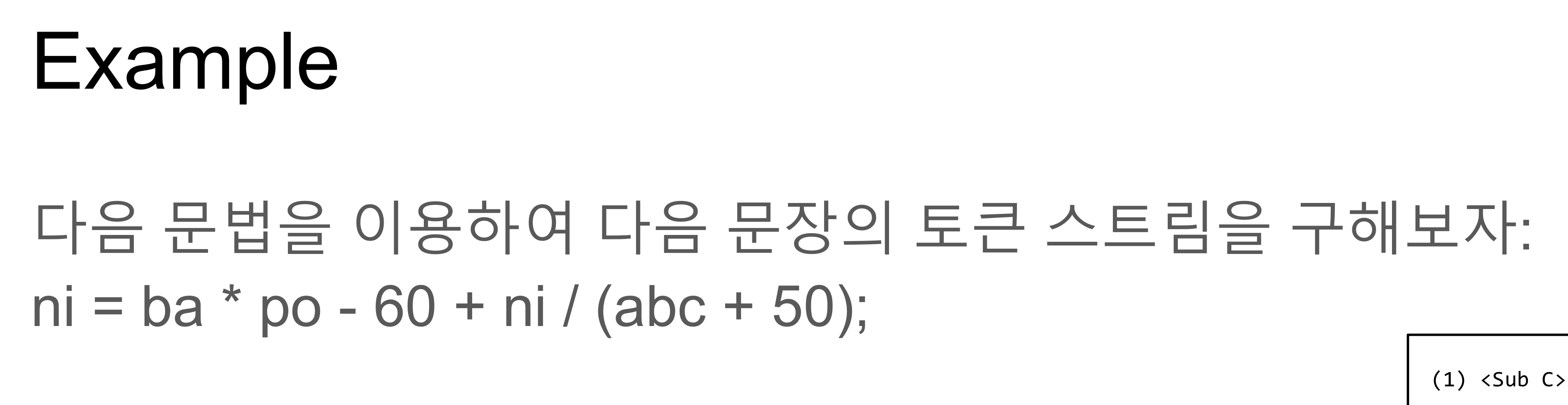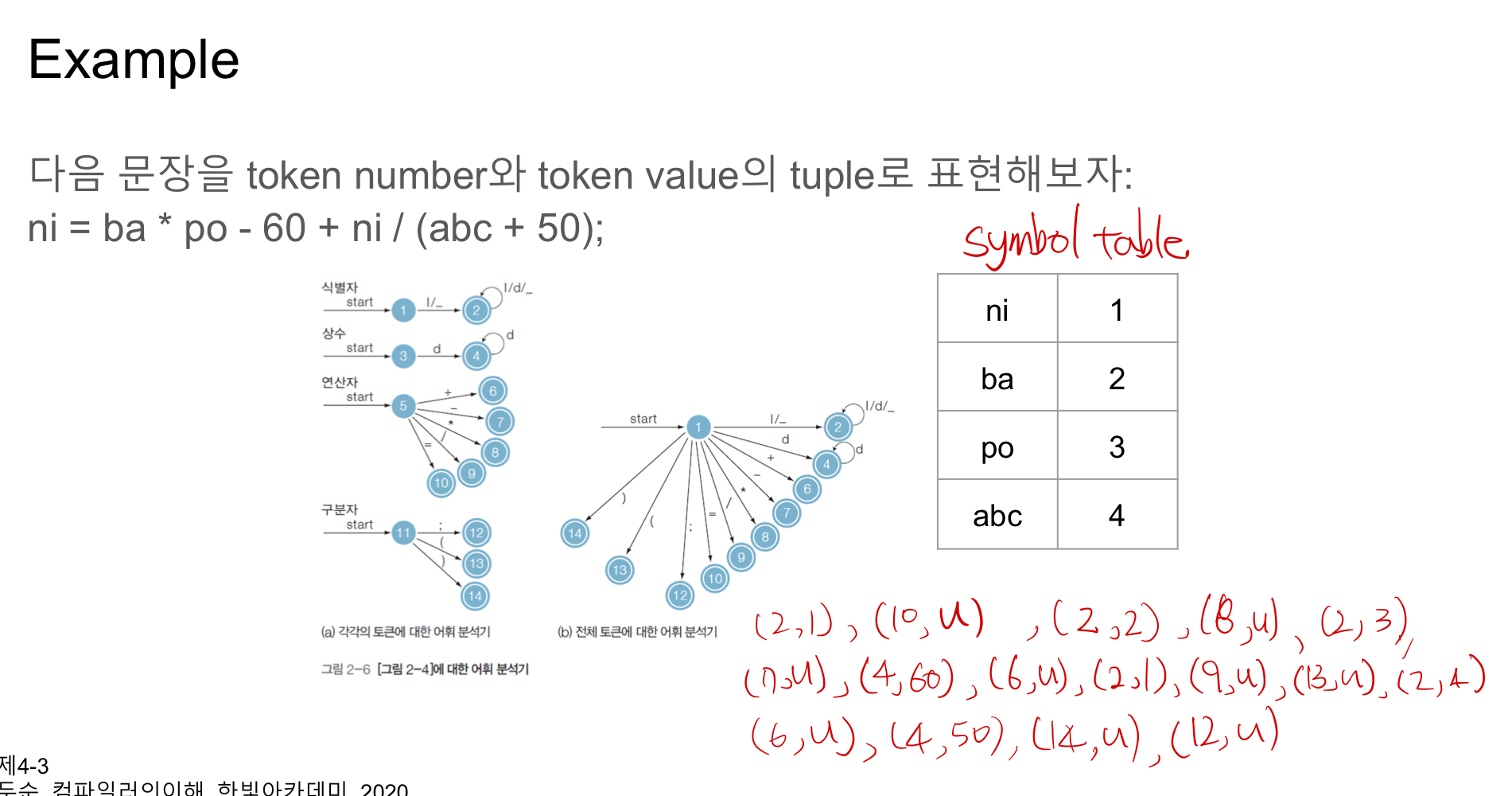 Token stream : 토큰을 token number와 token value의 tuple으로 표현(token number, token value)