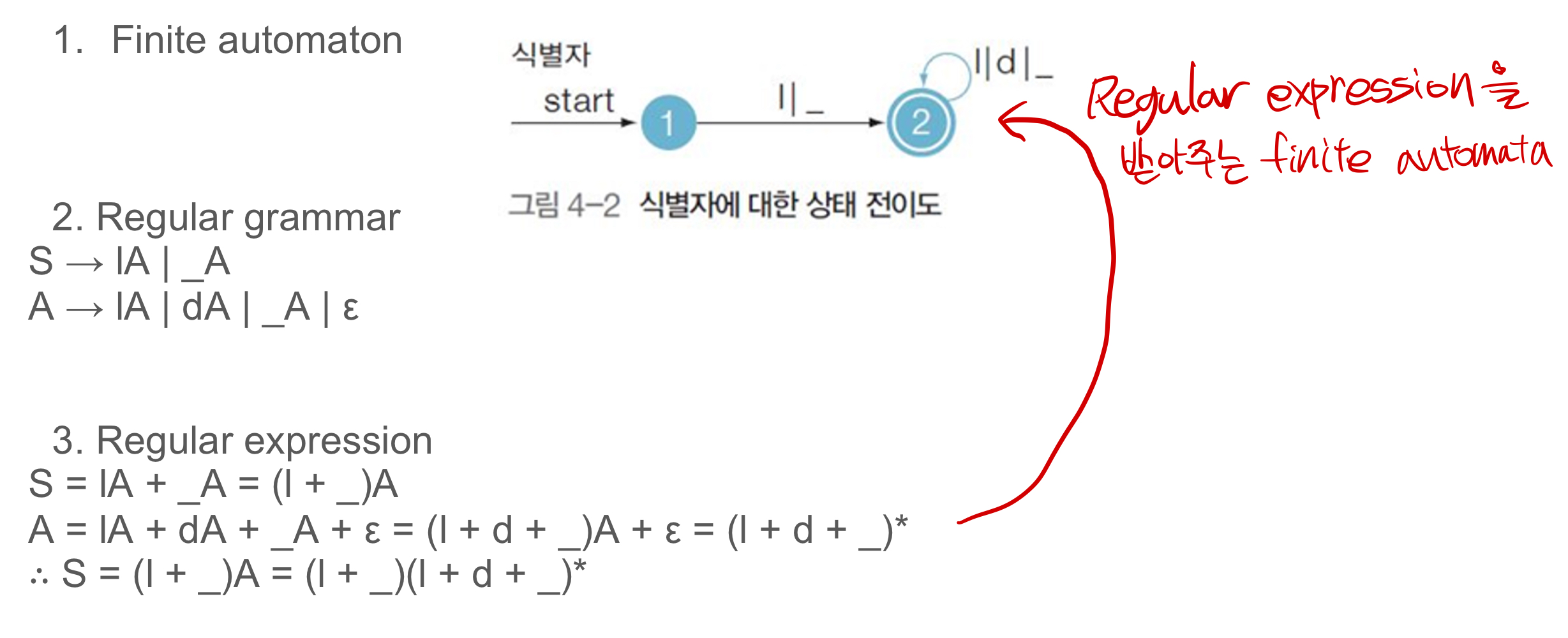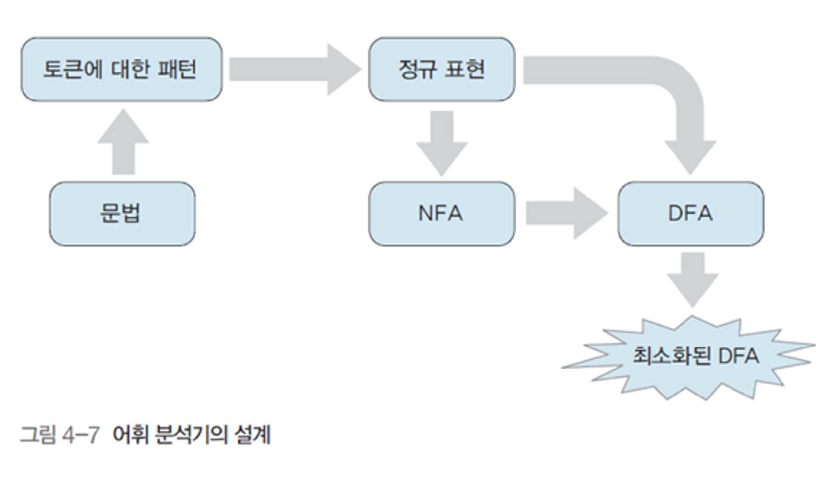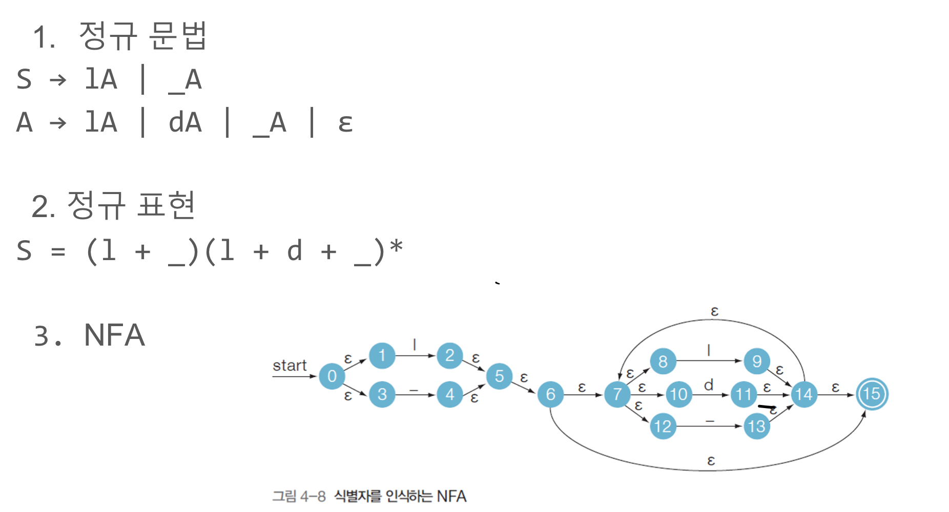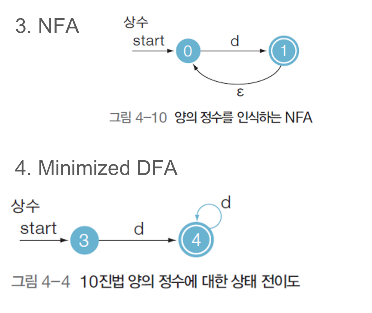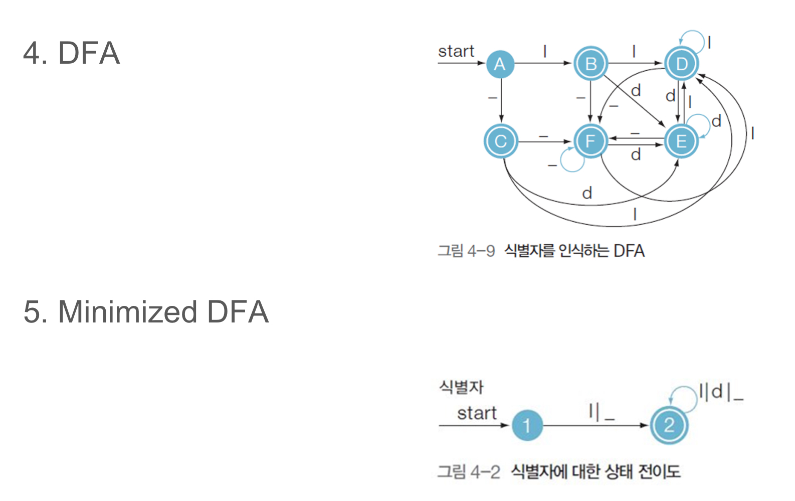 Recognition : regular expression으로 구성된 토큰을 받아들이는 finite automata이다.