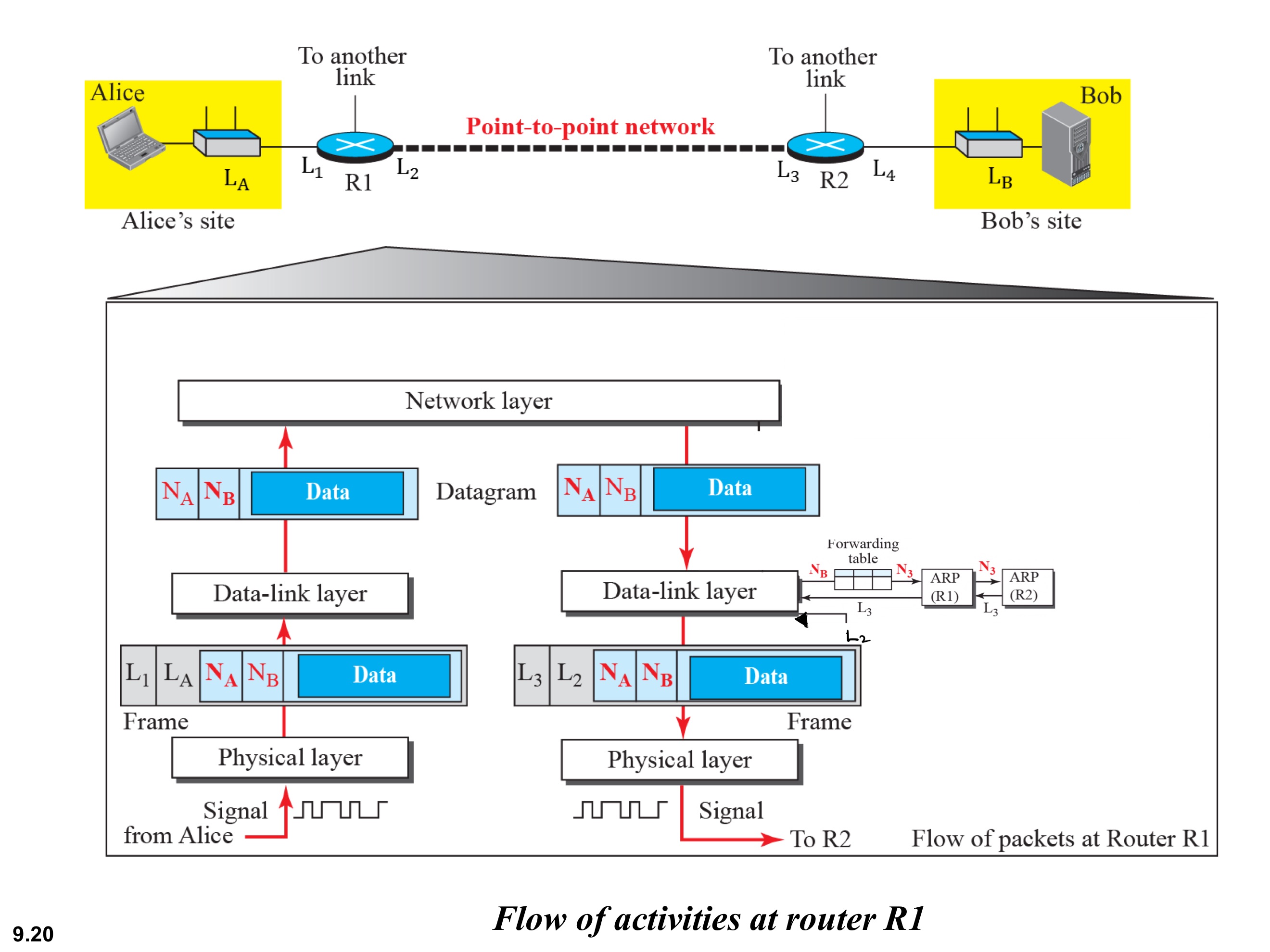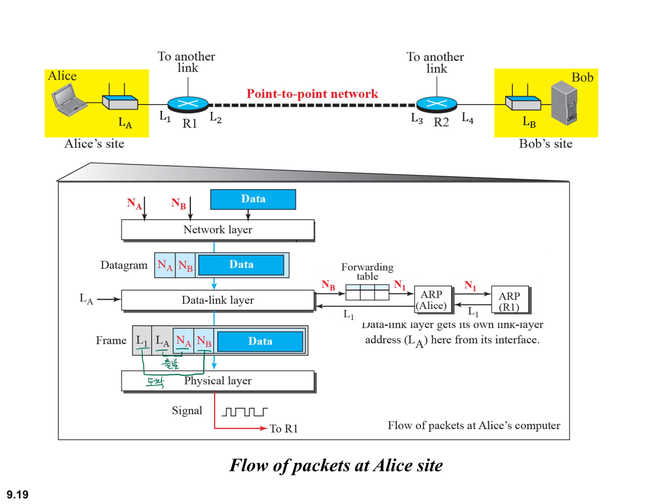 Alice에게서 온 signal은 R1 router로 보내지게 된다. Signal은 Physical layer 와 Data-link layer을 거치고 다시 역으로 거치면서 Data-link layer에서 다시 ARP가 발생해 다음 목적지의 data-link address인 L3를 받아오게 된다. 시작 data-link address인 L2와 도착 data-link address인 L3가 Datagram과 묶여 Frame이 되어 Signal로 전송되어진다. 위 동작이 R2에서도 반복된다.