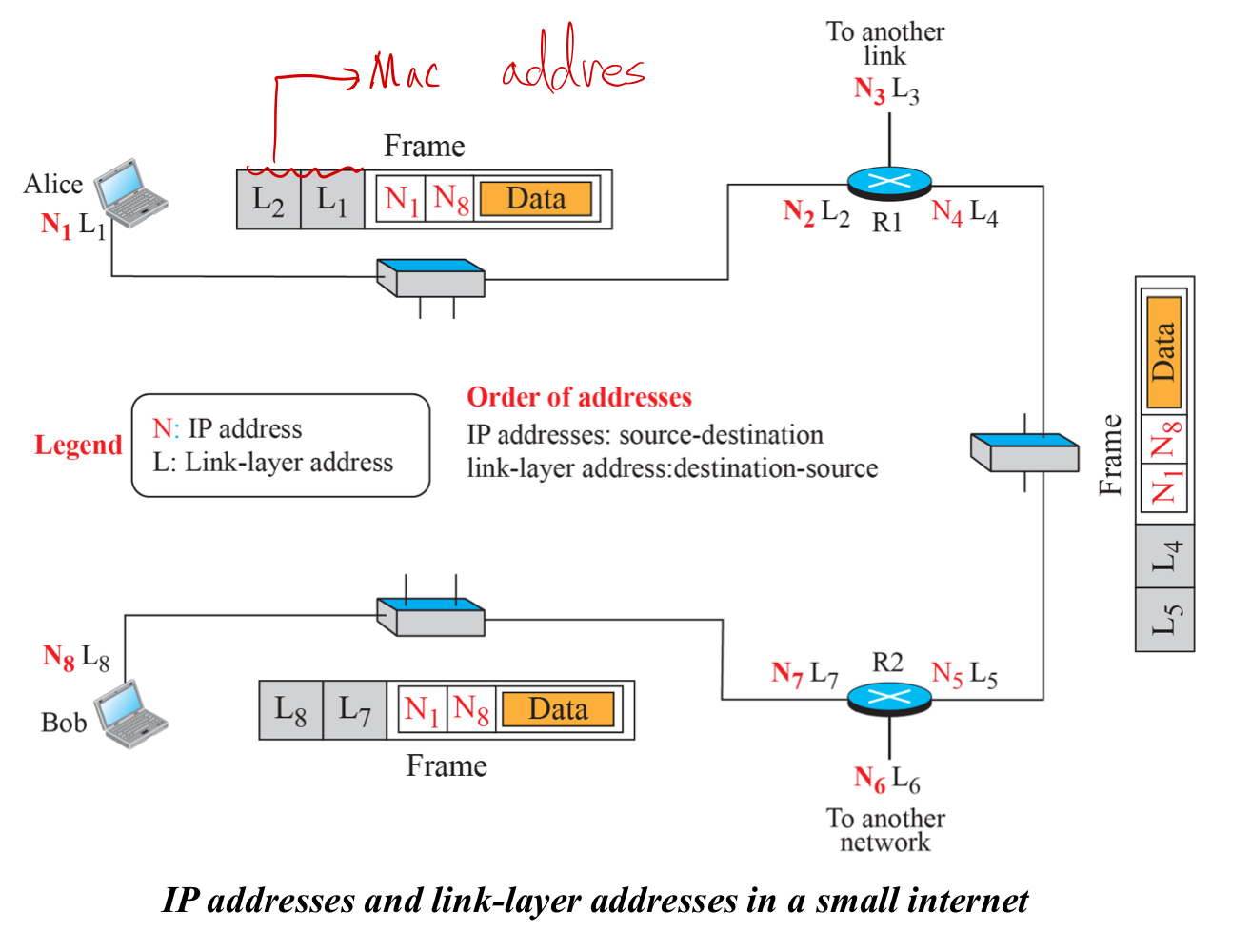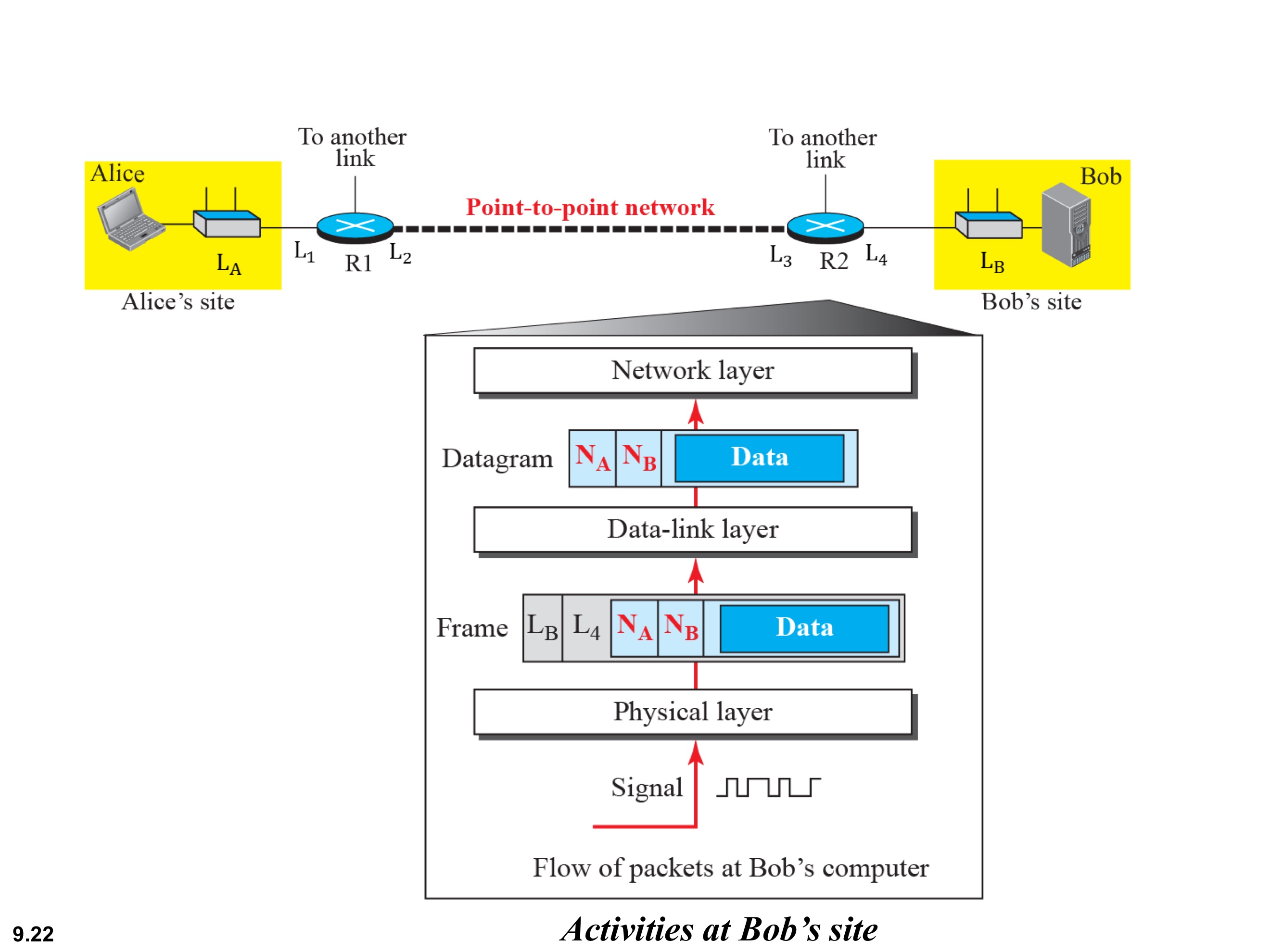 data-link layer에서의 communication은 node-to-node이다. 데이터는 목적지까지 가기 위해 많은 네트워크(LANs and WANs)를 거쳐야 한다.