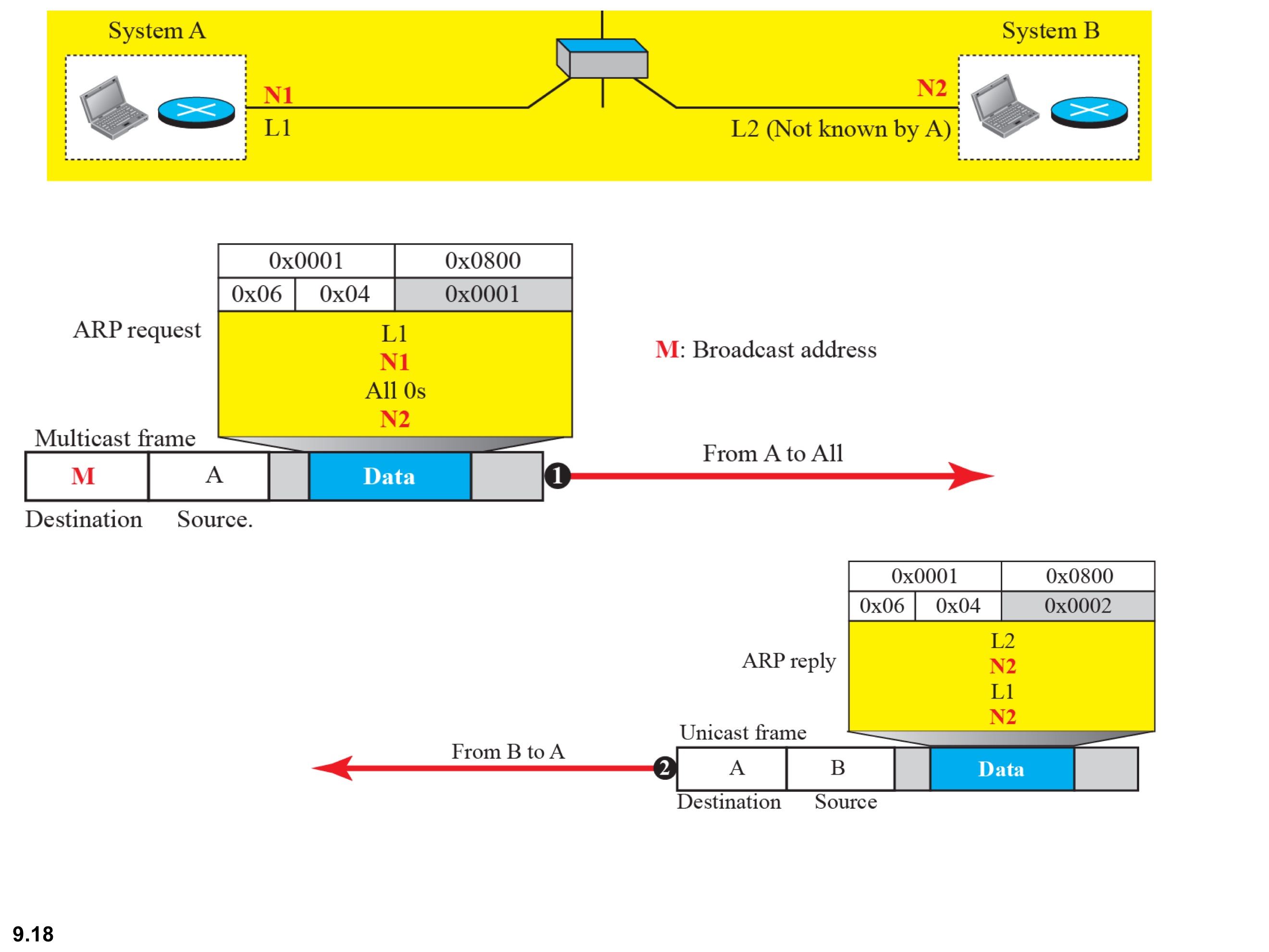 처음 N1에서 ARP request가 모두에게 일어난다. 그리고 ARP reply는 원하는 목적지는 N2에서만 일어나게 되고 L1에게만 보내지게 된다.