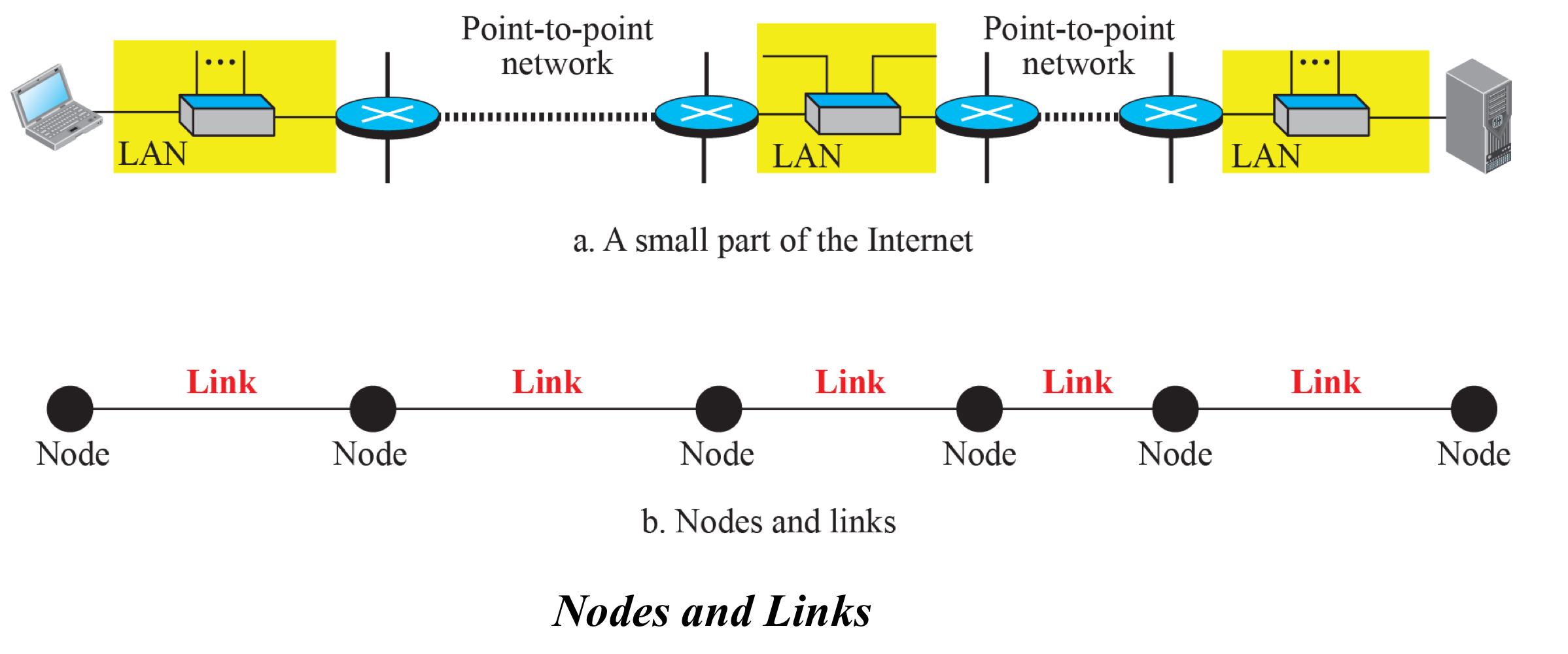 LANs와 WANs는 router로 연결되어있다. 우리는 보통 두 host와 router들을 node라 하고 그 사이의 network를 link라고 한다.